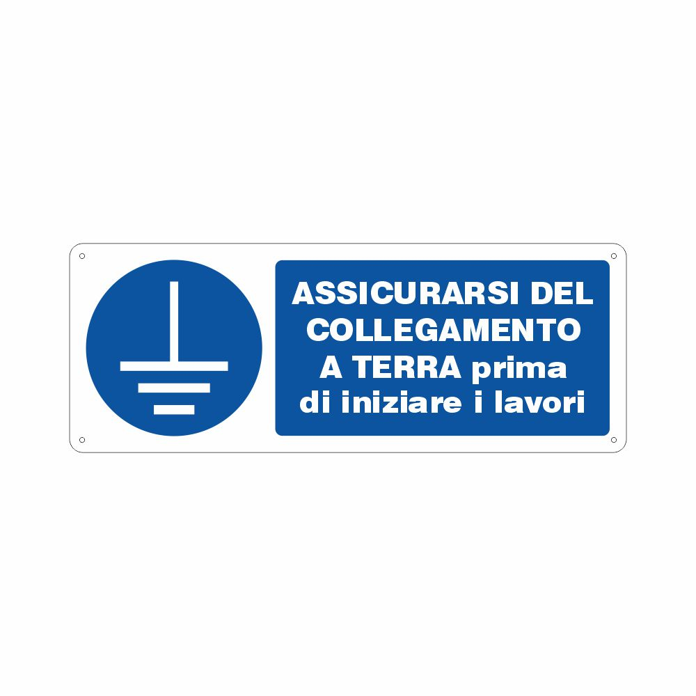 Cartello in alluminio preverniciato blu spessore 0,5 mm, stampa serigrafica scritta assicurarsi che la messa a terra sia collegata prima di dare inizio ai lavori, con indicazioni sulla distanza dal cartello. Formato 250x165 mm. Conforme D.Lgs. 81-08, UNI 7543.