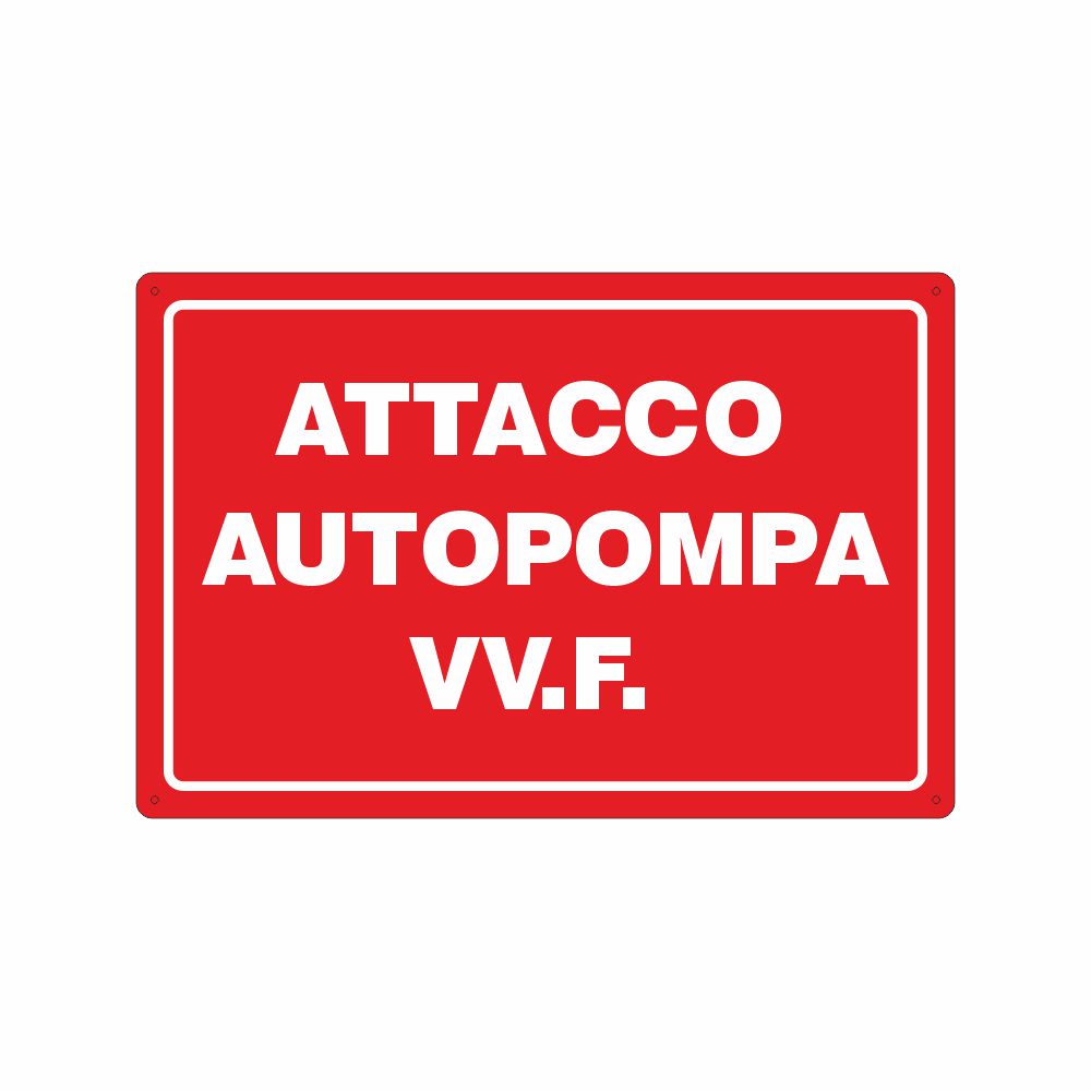 Cartello in alluminio preverniciato bianco (formato F) o rosso (formato B), spessore 0,5 mm, stampa serigrafica pittogramma e scritta Attacco di mandata per autopompa - pressione massima 1,2 MPa (12bar) - rete idranti antincendio. Conforme D.Lgs. 81-08, UNI 7543.