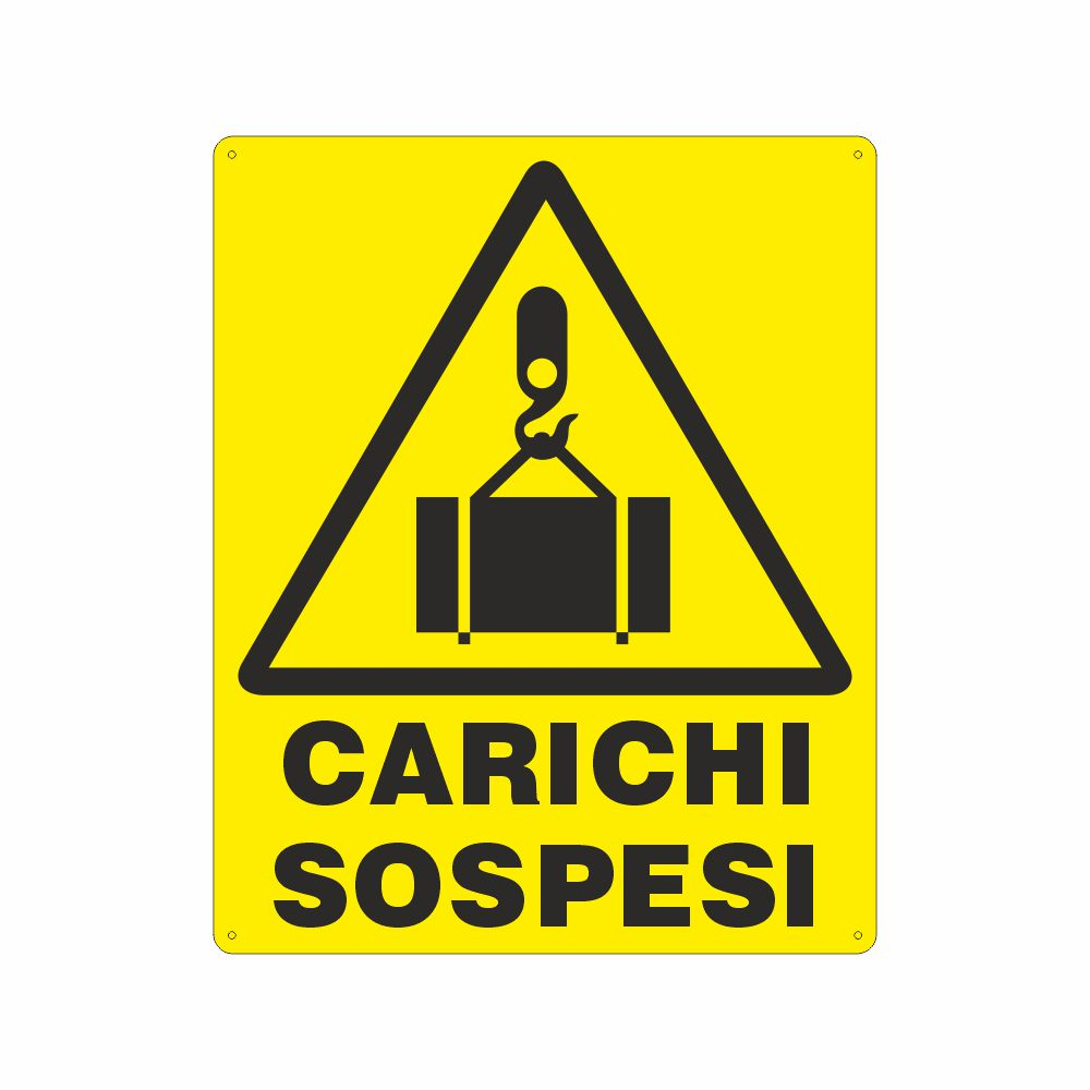 Cartello con simbolo W015 pericolo carichi sospesi Cartello in alluminio preverniciato giallo spessore 0,5 mm Pittogramma W015 pericolo carichi sospesi Corrispondente pittogramma UNI EN ISO 7010: Warning sign W015, Overhead load warning Stampa durevole e resistente. Angoli arrotondati. Imballo in nylon Disponibile in tre formati: A con dimensione 145x125 mm; F con dimensione 270x270 mm; B con dimensione 333x333 mm Distanza di visibilità: Formato A 3,5 metri; Formato F 7,5 metri; Formato B 9 metri Conforme D.Lgs. 81-08, UNI 7543, UNI EN ISO 7010. Utilizzo: il segnale si applica in prossimità di gru o carroponti per avvisare del pericolo derivato da carichi sospesi Metodo di adesione consigliato: collante siliconico su muro o su superficie liscia e piana
