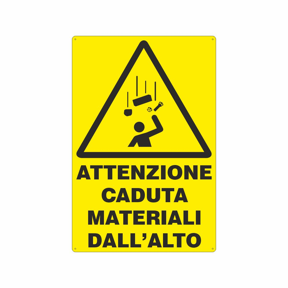 Cartello in alluminio preverniciato giallo spessore 0,5 mm, stampa serigrafica pittogramma e scritta Attenzione caduta materiali dall'alto, con fori e angoli arrotondati, imballo singolo.
