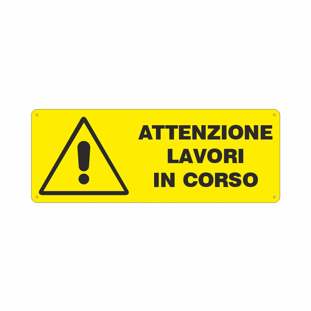 Cartello in alluminio preverniciato bianco spessore 0,5 mm, stampa serigrafica pittogrammi e scritta Lavori in Corso vietato l'accesso. Fori e angoli arrotondati, imballo singolo. Formato 500x333 mm. Conforme D.Lgs. 81/08, UNI 7543.