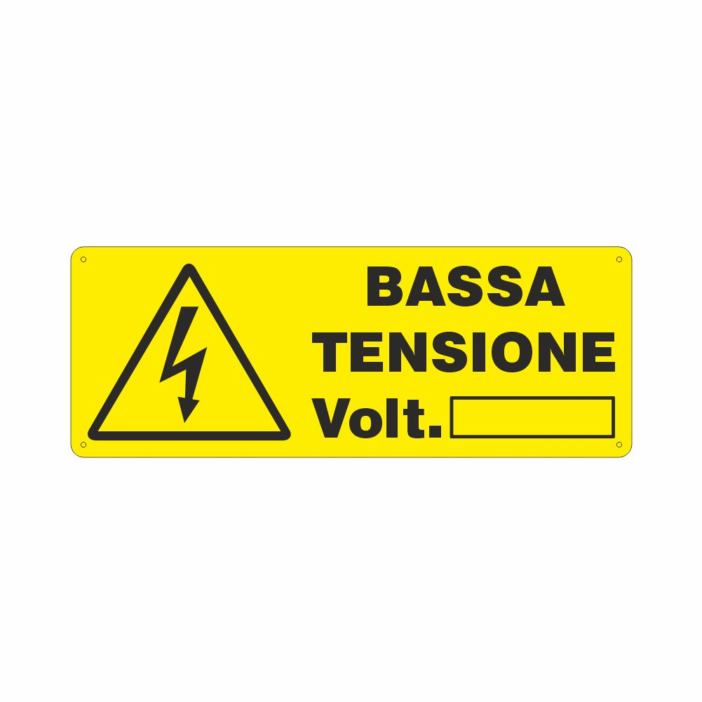 Cartello in alluminio preverniciato giallo spessore 0,5 mm, stampa serigrafica pittogramma e scritta alta tensione volt, con spazio per la compilazione, fori e angoli arrotondati, imballo singolo. Formato 333x125 mm. Conforme D.Lgs. 81-08 e UNI 7543.
