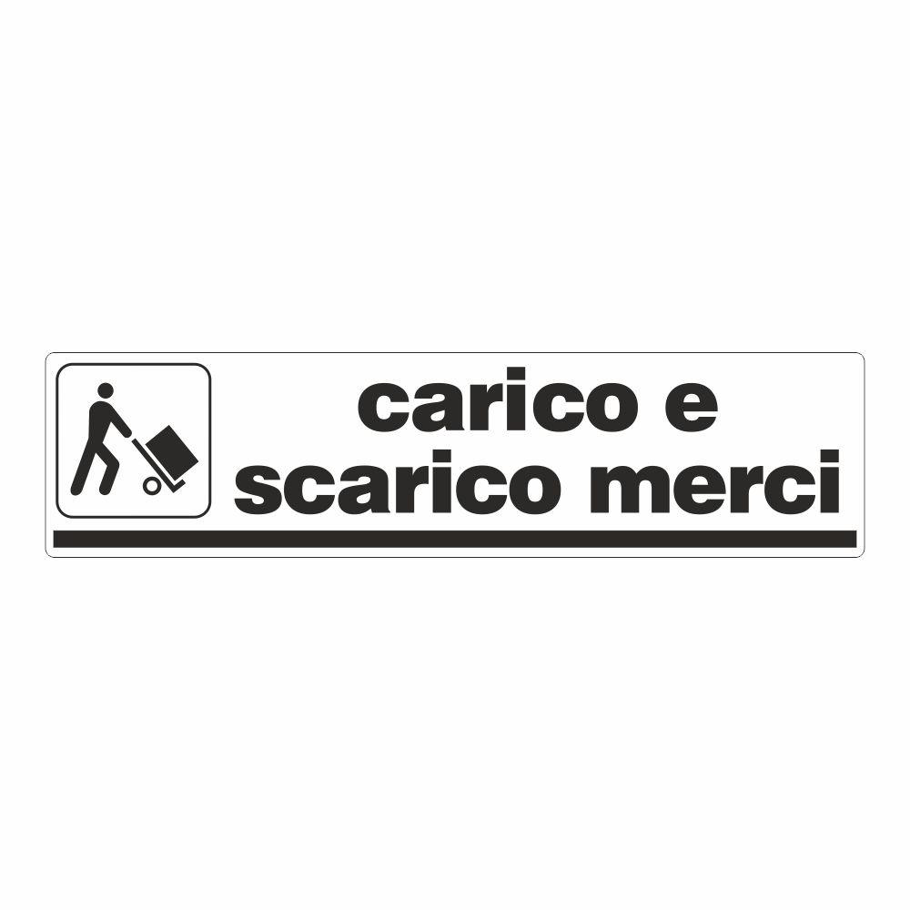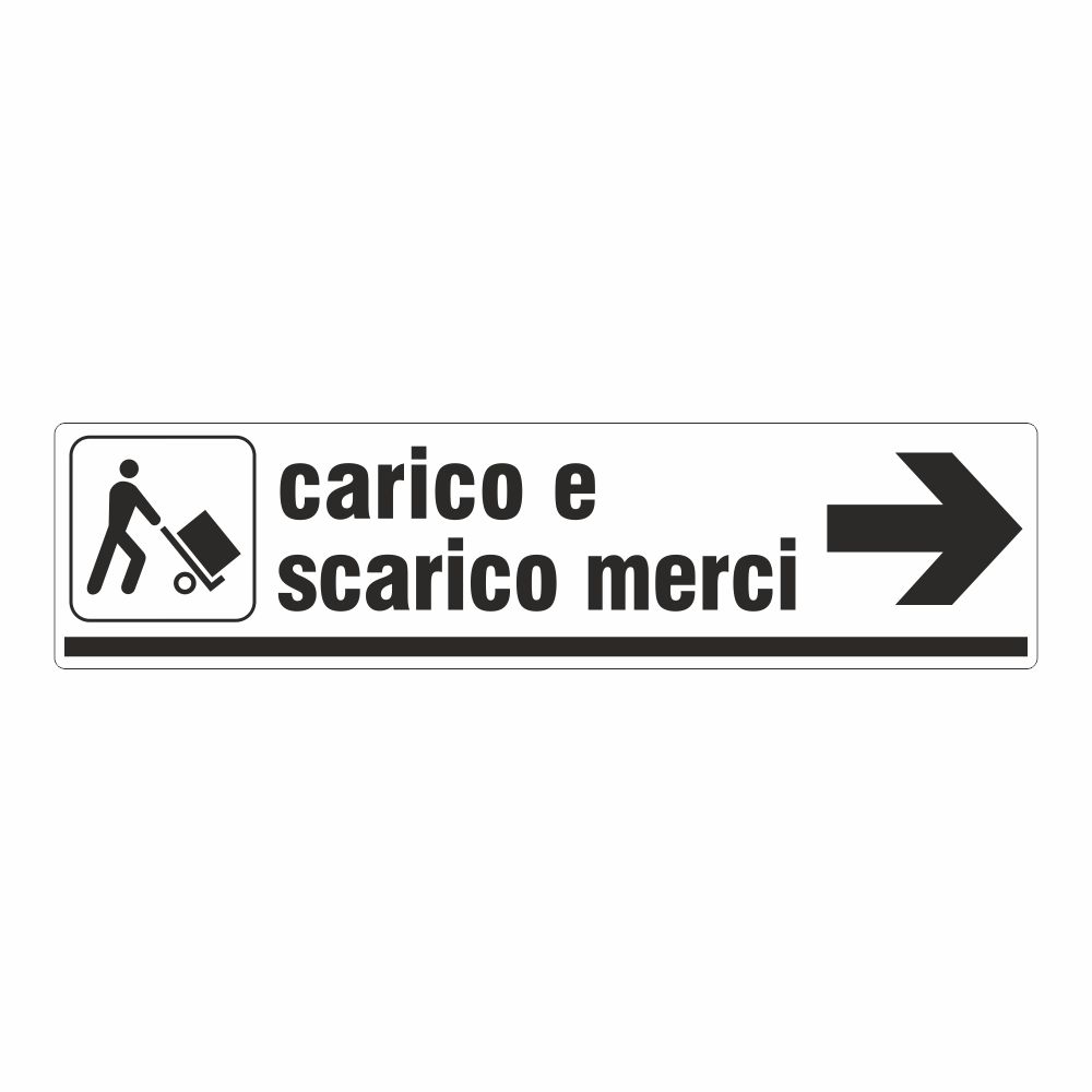 Cartello in alluminio preverniciato bianco spessore 0,5 mm, decorazione in pvc pittogramma e scritta Carico merci freccia direzionale. Formato 1000x250 mm. Conforme D.Lgs. 81-08 e UNI 7543.