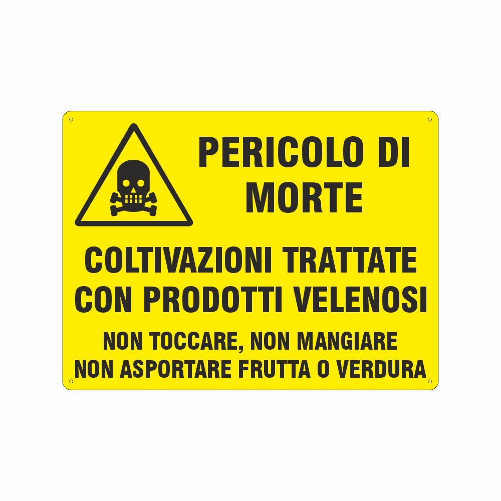 Cartello in alluminio preverniciato giallo spessore 0,5 mm, stampa serigrafica pittogramma e scritta Pericolo di morte - coltivazioni trattate con prodotti velenosi - non toccare, non mangiare, non asportare frutta o verdura, fori e angoli arrotondati, imballo singolo.