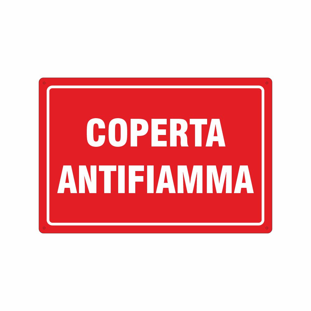Cartello in alluminio preverniciato bianco, spessore 0,5 mm, stampa serigrafica pittogramma e scritta Coperta antifiamma. Formato 230x310 mm. Conforme D.Lgs. 81-08, UNI 7543.