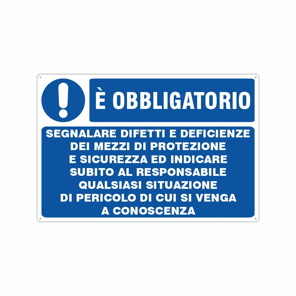 Cartello in alluminio preverniciato bianco spessore 0,5 mm, stampa serigrafica pittogrammi e scritta è obbligatorio segnalare difetti e deficienze dei mezzi di protezione e sicurezza ed indicare subito al responsabile qualsiasi situazione di pericolo di cui si venga a conoscenza.