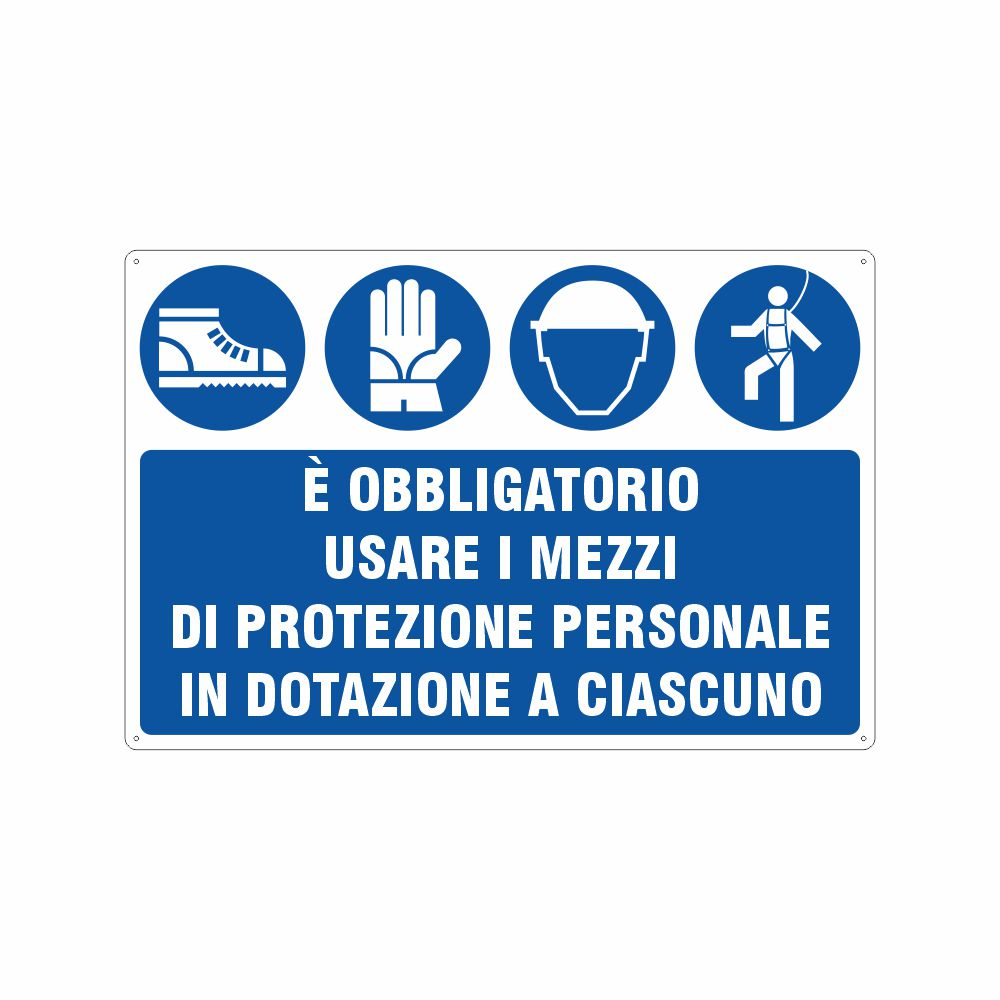 Simboli è obbligatorio indossare calzature di sicurezza, guanti di protezione, elmetto o casco protettivo, imbracatura di sicurezza; scritta è obbligatorio usare i mezzi di protezione personale in dotazione a ciascuno