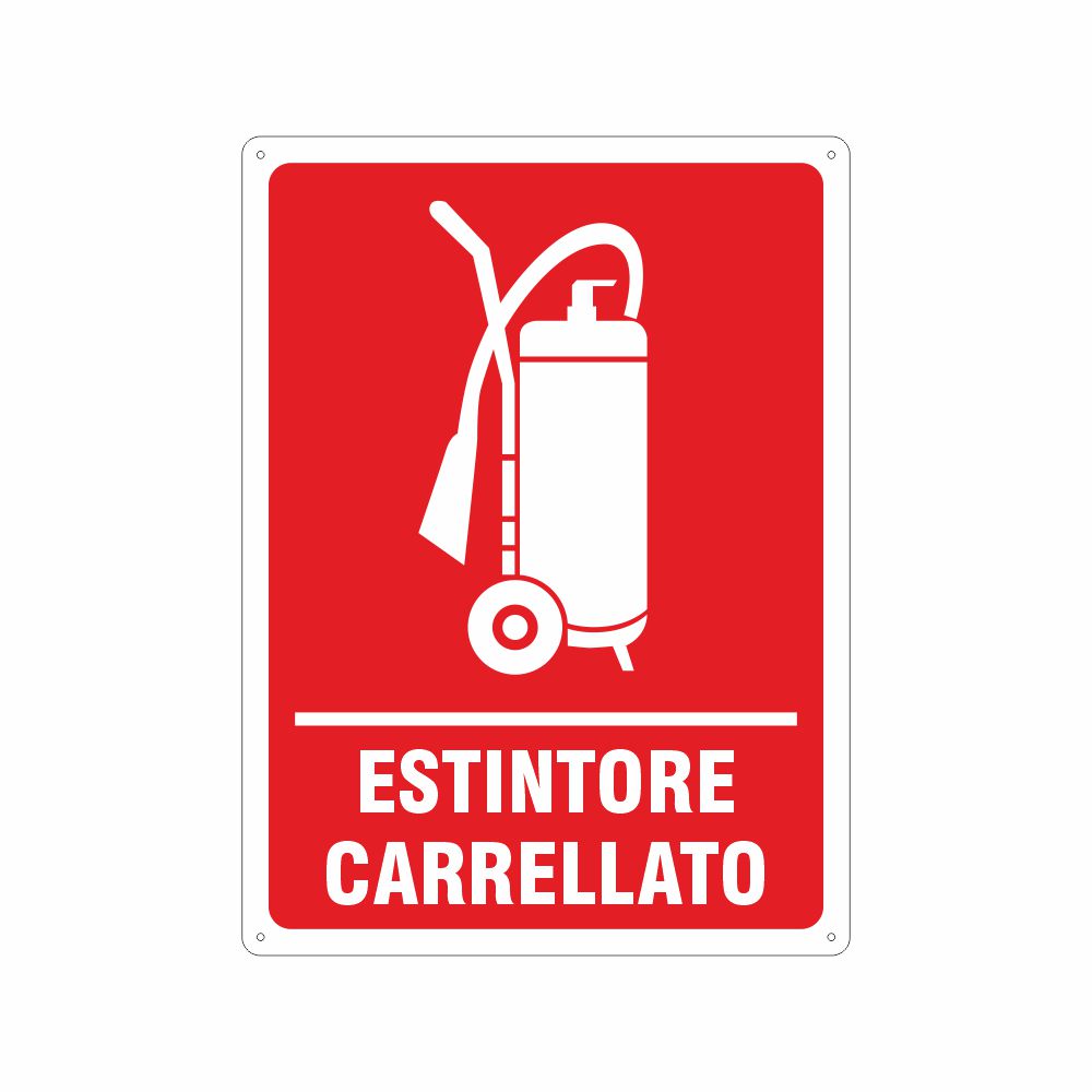 Cartello in alluminio preverniciato bianco, spessore 0,5 mm, pittogramma e scritta Estintore Carrellato con spazio per il numero conforme UNI EN ISO 7010. Formato 333x500 mm. Conforme D.Lgs. 81-08, UNI 7543, UNI EN ISO 7010.
