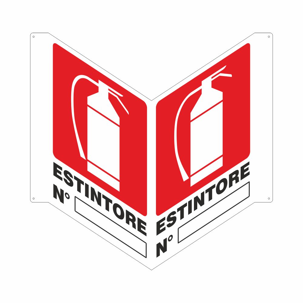 Cartello in alluminio preverniciato bianco spessore 0,5 mm, bifacciale piegato, stampa serigrafica pittogramma e scritta Estintore con spazio per il numero.