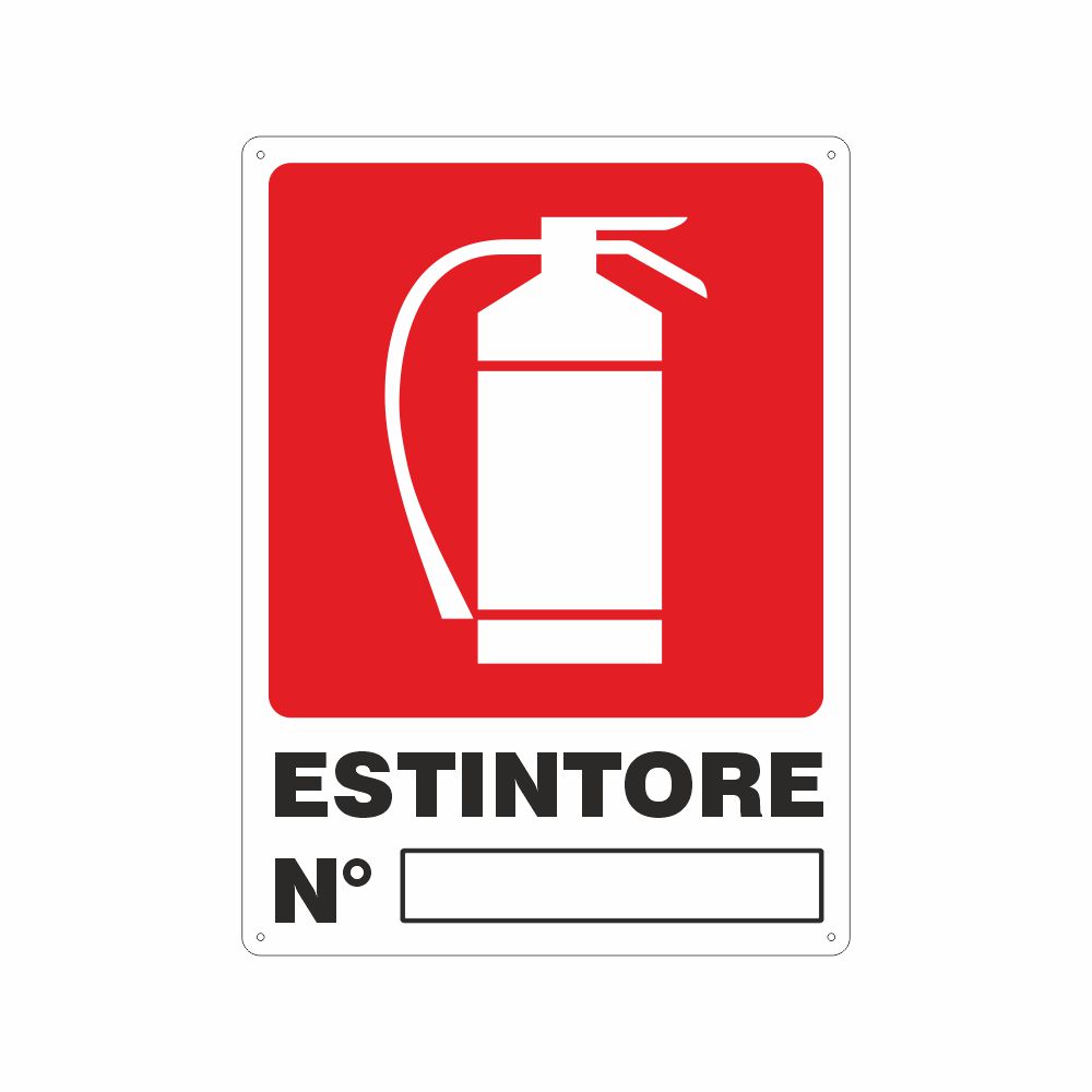 Cartello in alluminio preverniciato, spessore 0,5 mm, stampa serigrafica pittogramma e scritta estintore numero conforme UNI EN ISO 7010. Conforme D.Lgs. 81-08, UNI 7543, UNI EN ISO 7010.