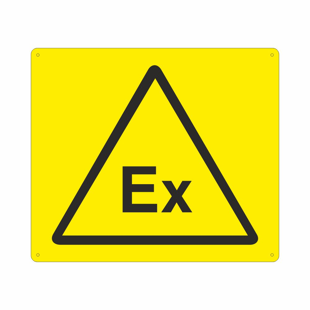 Cartello in alluminio preverniciato giallo spessore 0,5 mm, stampa serigrafica pittogramma e scritta EX pericolo possibile concentrazione esplosiva, con fori e angoli arrotondati, imballo singolo. Conforme D.Lgs. 81-08 e UNI 7543.