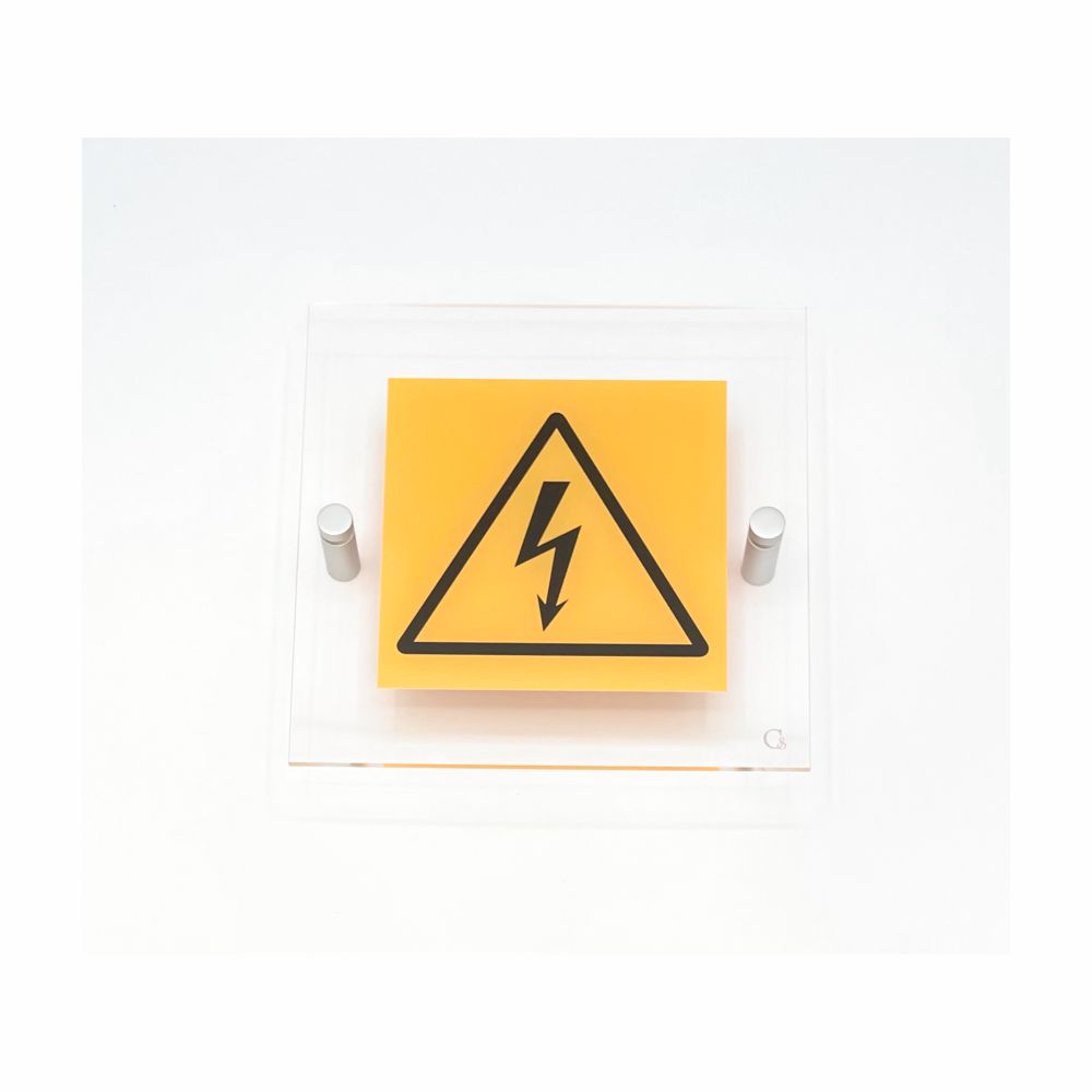 Cartello serie Avantgarde, in plexiglass trasparente spessore 3 mm, con pittogramma Pericolo corrente elettrica conforme UNI EN ISO 7010.