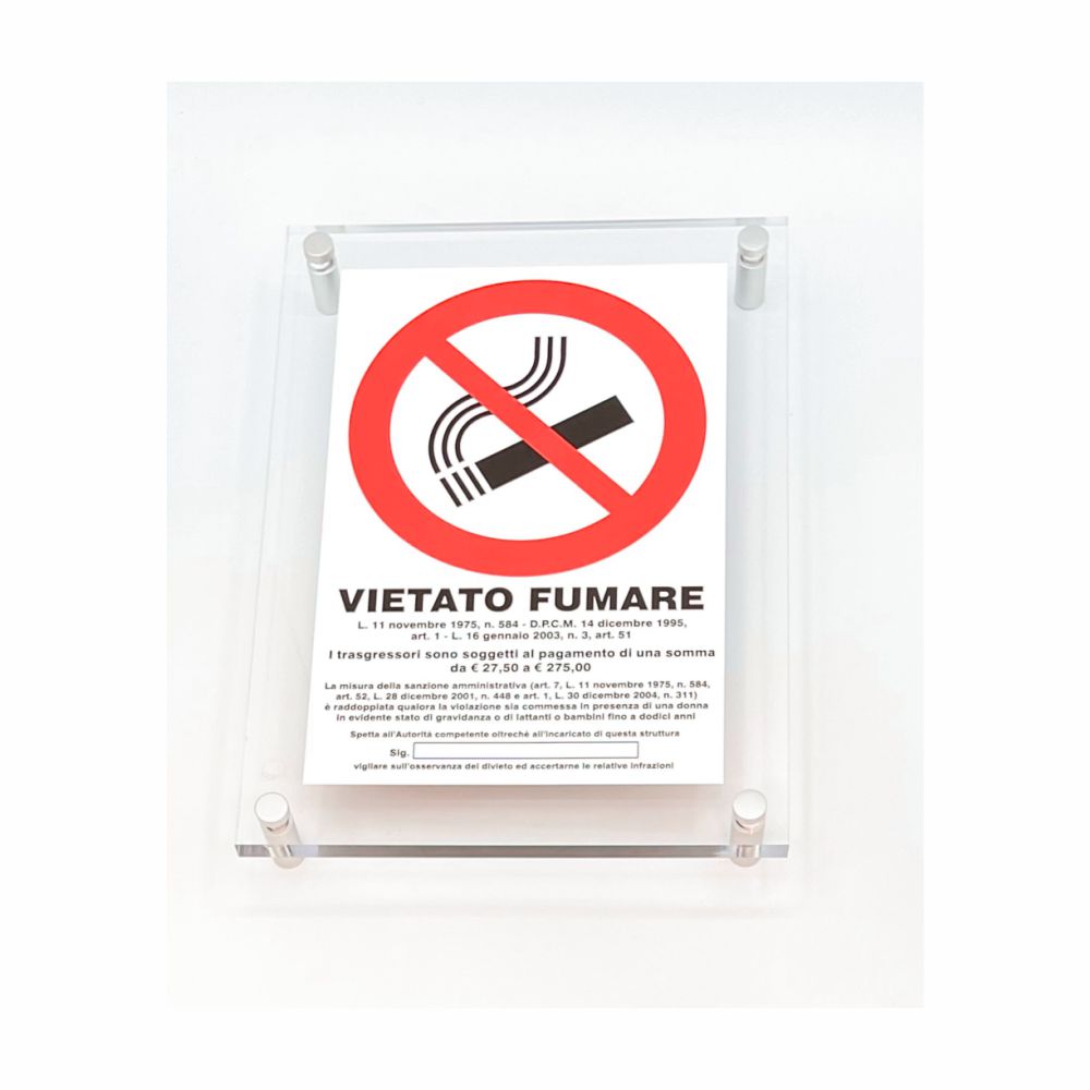 Cartello serie Plexline, in plexiglass trasparente o satinato, spessore 8 mm, pittogramma e normativa vietato fumare.