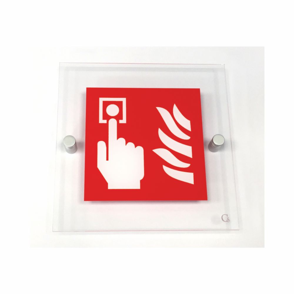Cartello serie Avantgarde, in plexiglass trasparente o satinato, spessore 3 mm, con pittogramma pulsante allarme antincendio conforme UNI EN ISO 7010.
