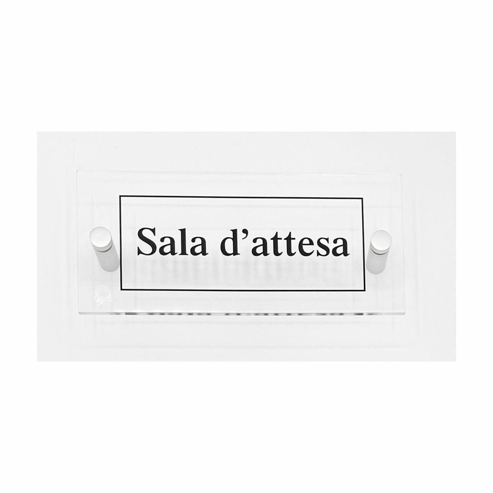 N.B: Le immagini hanno carattere indicativo. Il prodotto è fornito di serie con scritta nera "Sala d'attesa" e distanziali a vite in alluminio argento satinato.