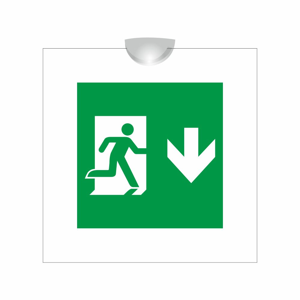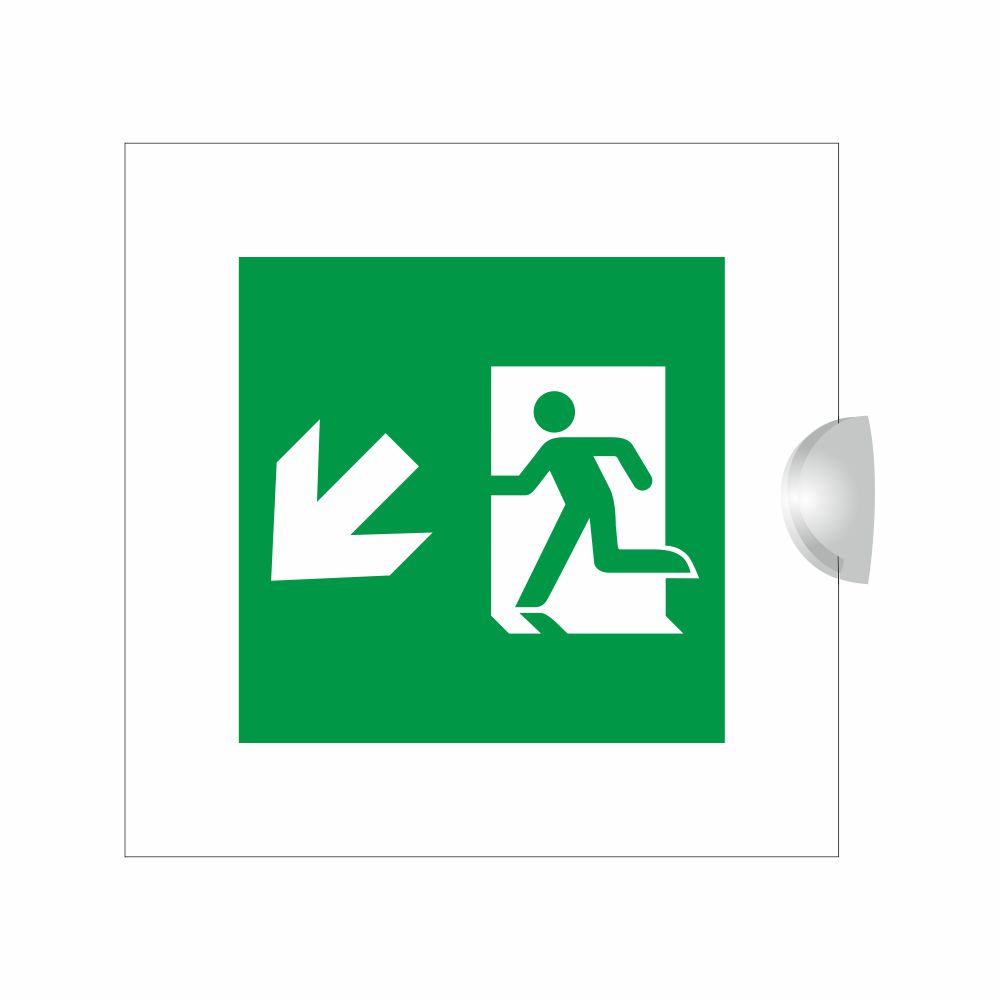 Cartello bifacciale serie Plexline, in plexiglass trasparente o satinato, spessore 3 mm, con pittogramma uscita di emergenza conforme UNI EN ISO 7010.