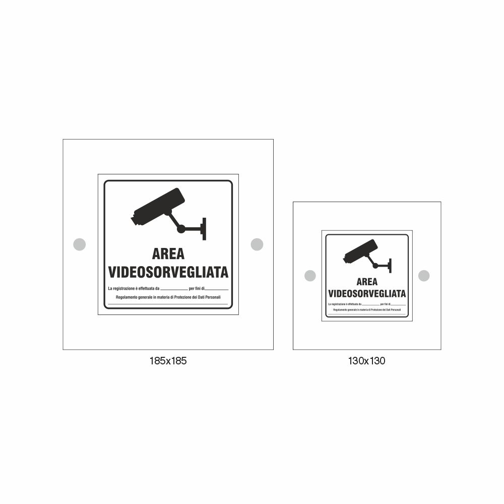 Cartello serie Plexline, in plexiglass trasparente o satinato, spessore 3 mm, con pittogramma e scritta Area Videosorvegliata.