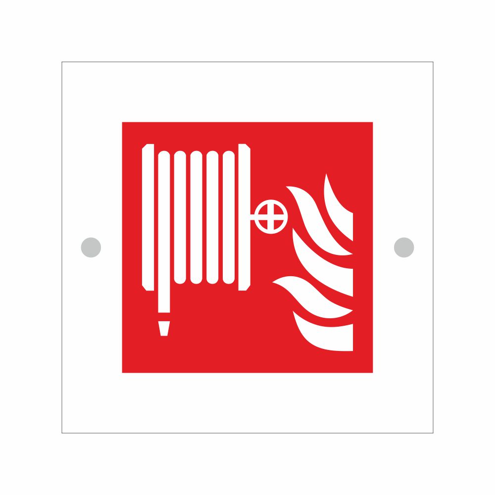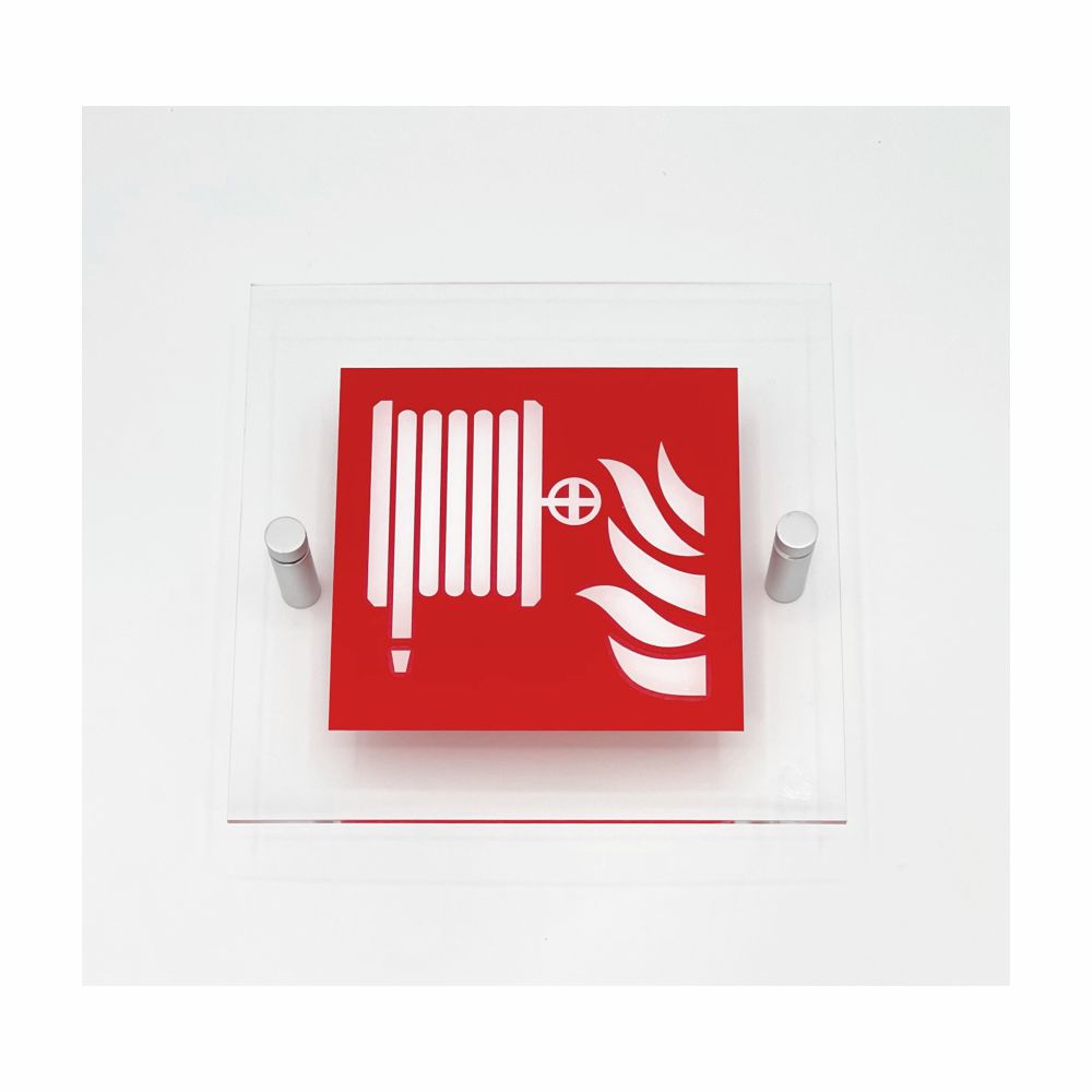 Cartello serie Plexline Economy in plexiglass trasparente spessore 2 mm, con pittogramma Lancia antincendio conforme UNI EN ISO 7010.