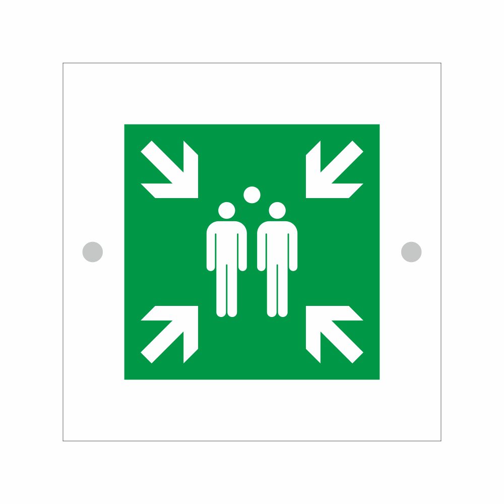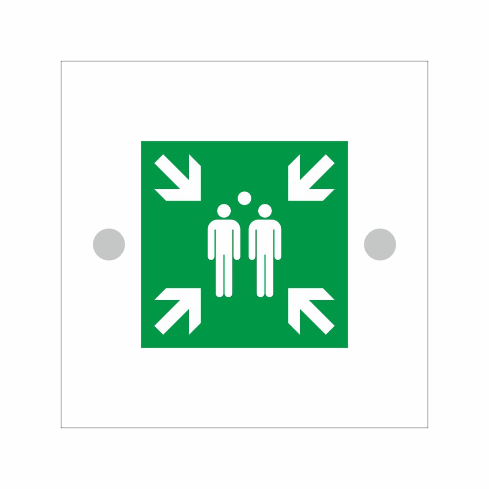 Cartello serie Plexline, in plexiglass trasparente o satinato, spessore 3 mm, con pittogramma Punto di ritrovo conforme UNI EN ISO 7010.