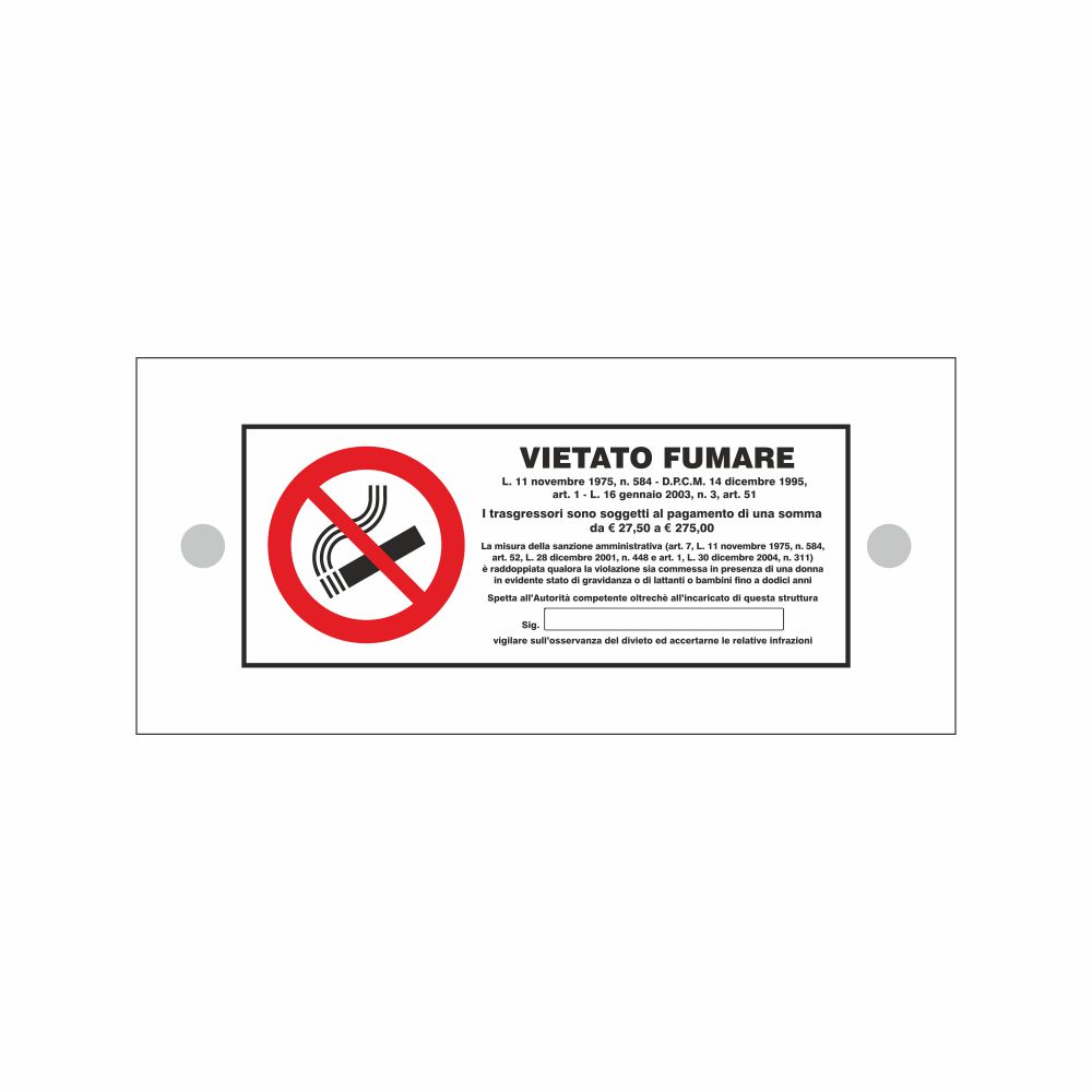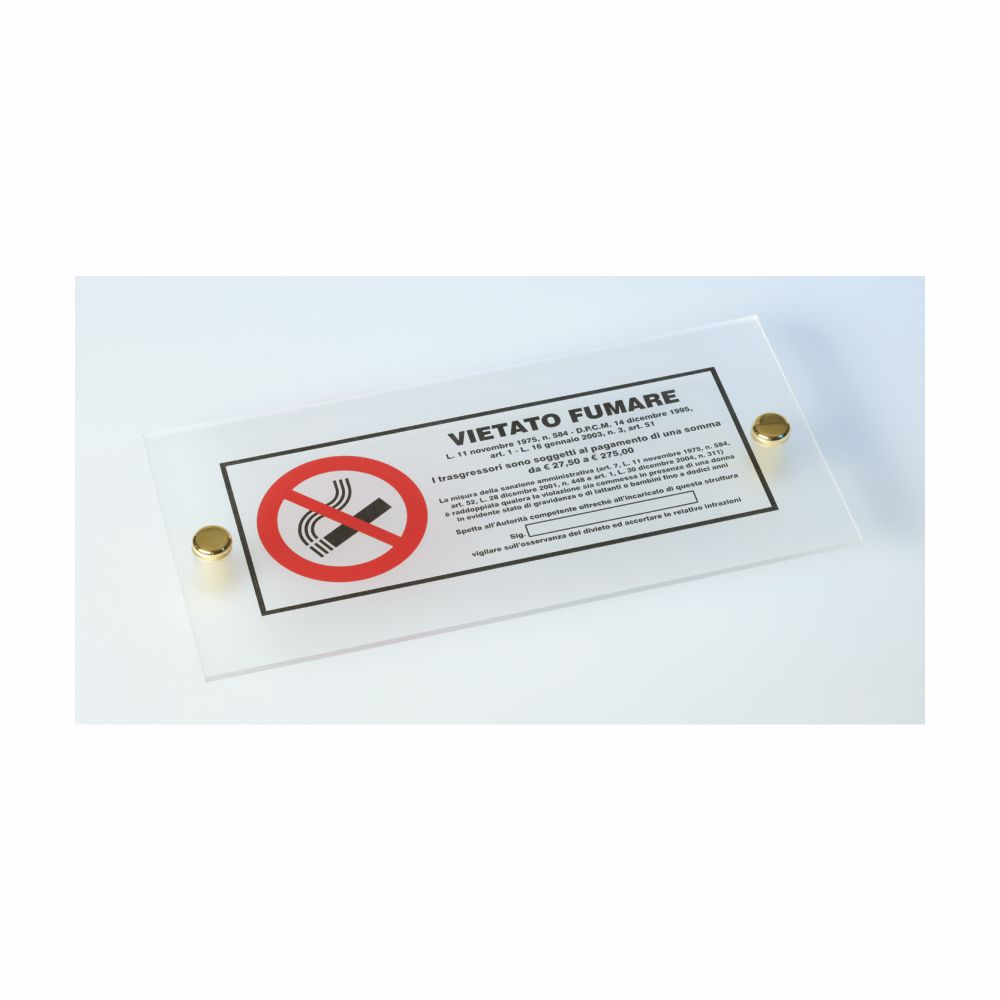 Cartello serie Plexline, in plexiglass trasparente o satinato, spessore 3 mm, con simbolo e normativa Vietato Fumare