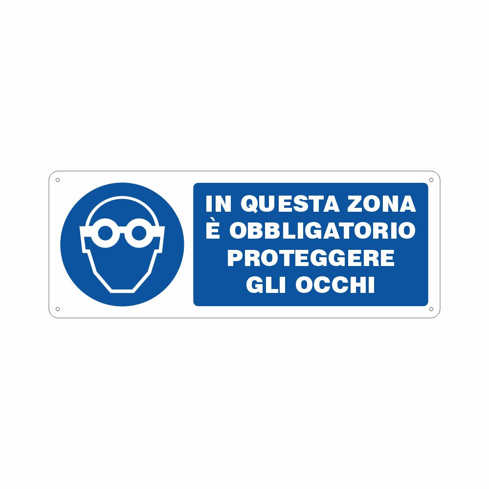 Cartello in alluminio preverniciato bianco spessore 0,5 mm, stampa serigrafica pittogramma e scritta E' Obbligatorio proteggere gli occhi, con fori e angoli arrotondati, imballo singolo. Conforme D.Lgs. 81-08 e UNI 7543. Le misure delle varianti sono espresse in mm.