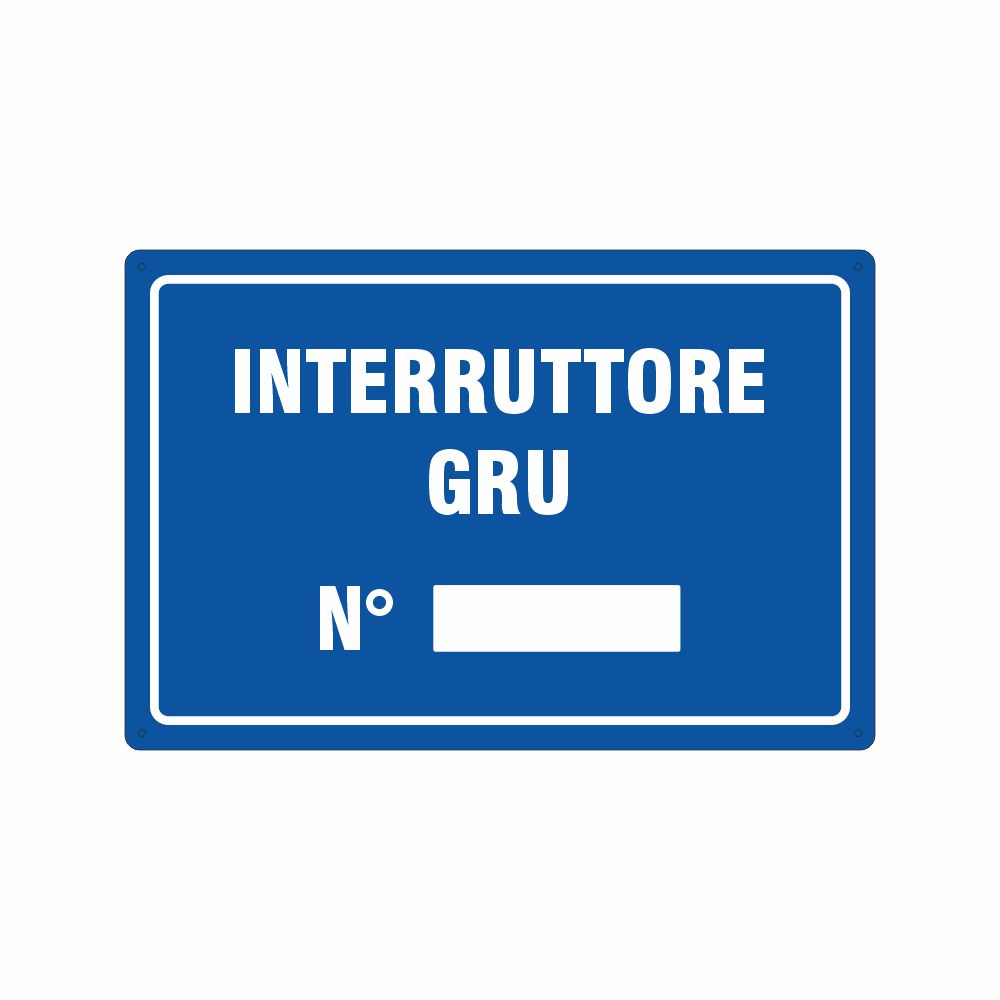 Cartello in alluminio preverniciato blu spessore 0,5 mm, stampa serigrafica scritta interruttore paranco con spazio per il numero. Formato 200x150 mm. Conforme D.Lgs. 81-08, UNI 7543.
