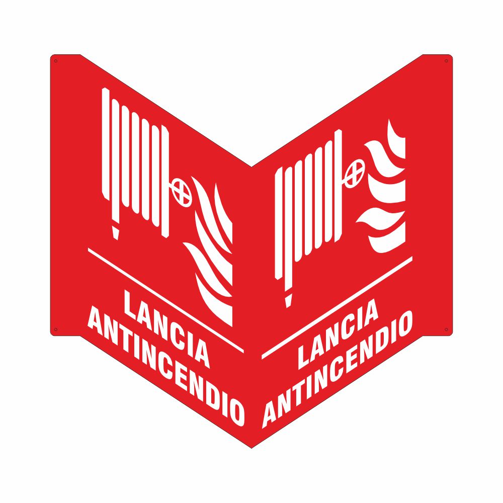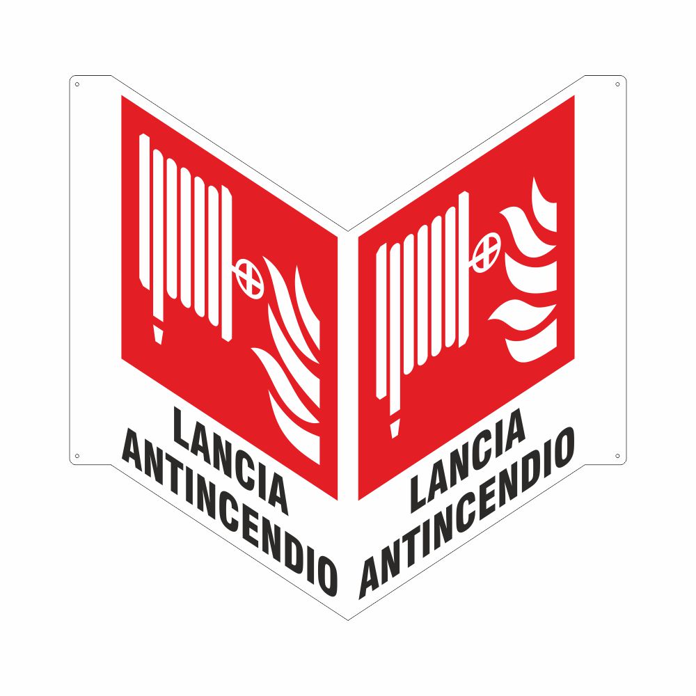 Cartello in alluminio preverniciato bianco (variante F e FN) o rosso (variante B) spessore 0,5 mm, bifacciale piegato, stampa serigrafica pittogramma e scritta Lancia antincendio.