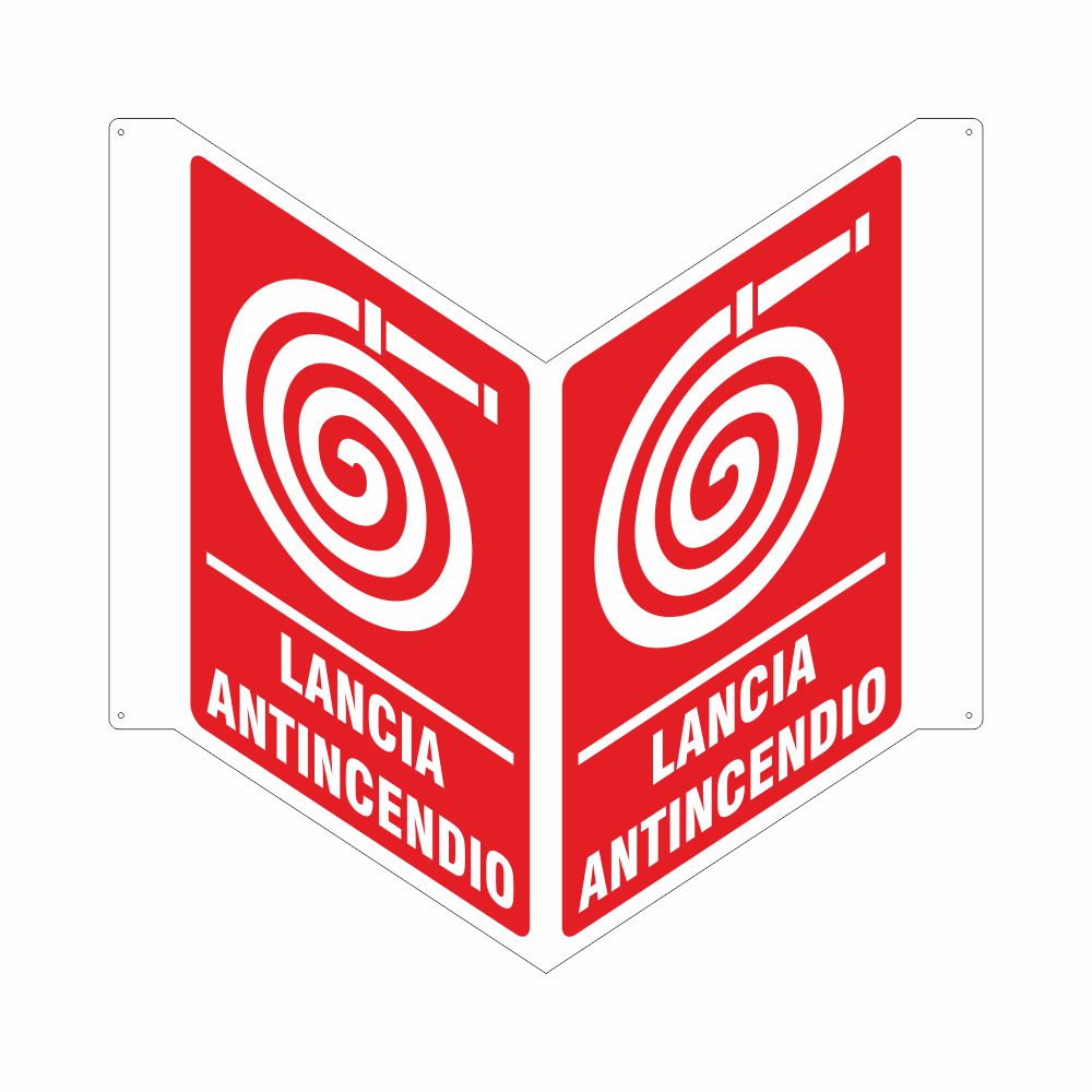 Cartello in alluminio preverniciato bianco (variante F e FN) o rosso (variante B) spessore 0,5 mm, bifacciale piegato, stampa serigrafica pittogramma e scritta Lancia antincendio. Nella scelta del Formato sono indicate le dimensioni del singolo cartello come fosse monofacciale. Le dimensioni totali del cartello bifacciale sono invece le seguenti: Variante FN - Formato cartello 230x310 mm, formato aperto 540x310 mm. Aletta 40 mm con fori e angoli. Dimensioni totali del cartello piegato 390x310x190 mm. Variante B - Formato cartello 333x500 mm, formato aperto 746x500 mm. Aletta 40 mm con fori e angoli. Dimensioni totali del cartello piegato 520x500x360 mm. Conforme D.Lgs. 81-08, UNI 7543, UNI EN ISO 7010.