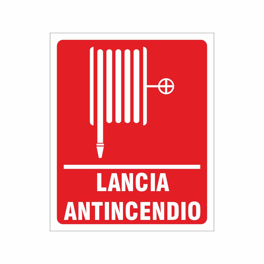 Cartello in alluminio preverniciato bianco spessore 0,5 mm, stampa serigrafica pittogramma e scritta lancia antincendio conforme UNI EN ISO 7010. Conforme D.Lgs. 81-08, UNI 7543, UNI EN ISO 7010.