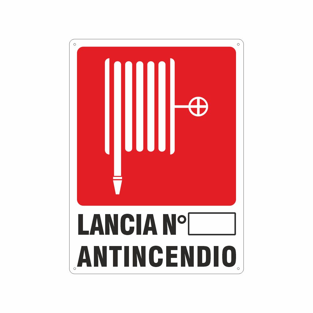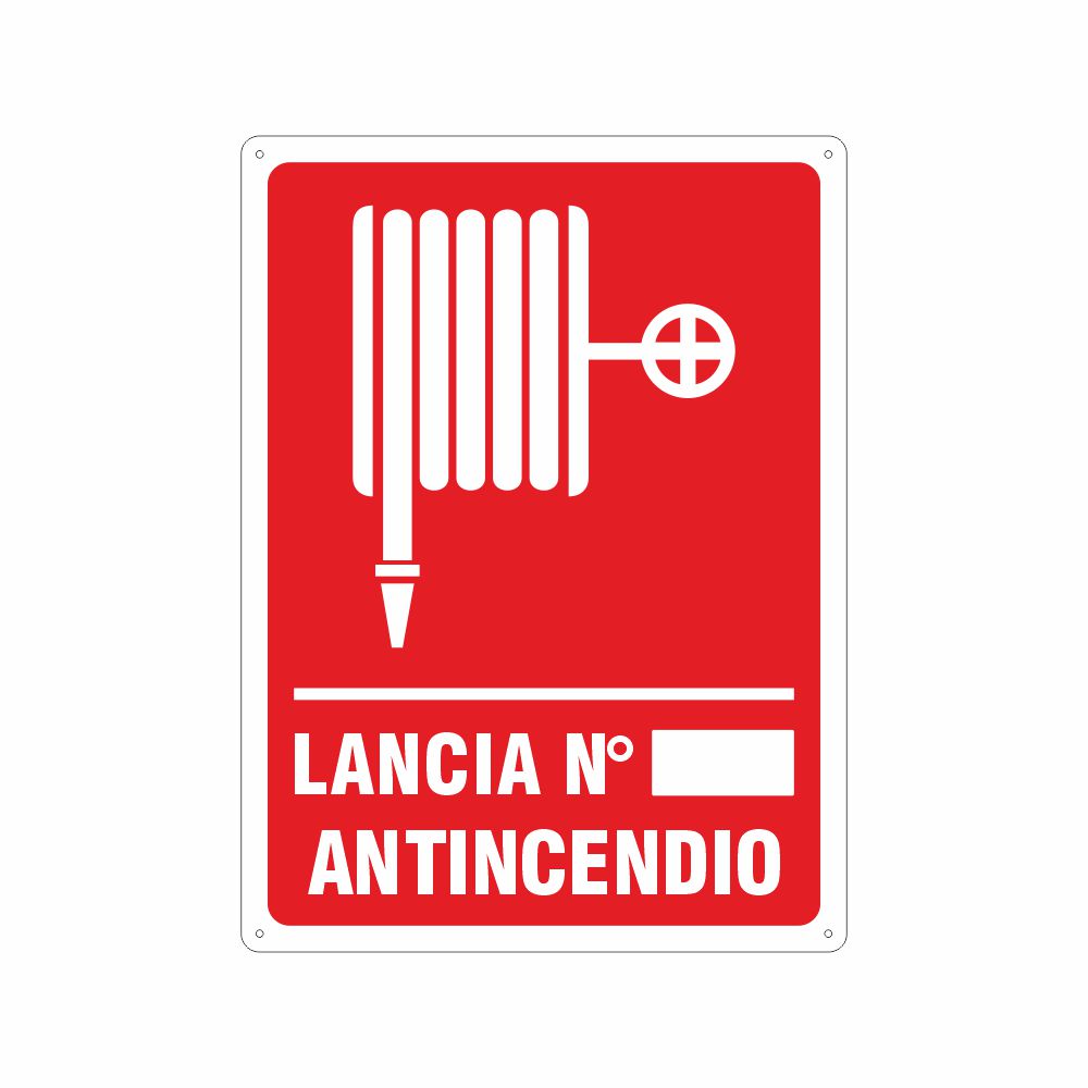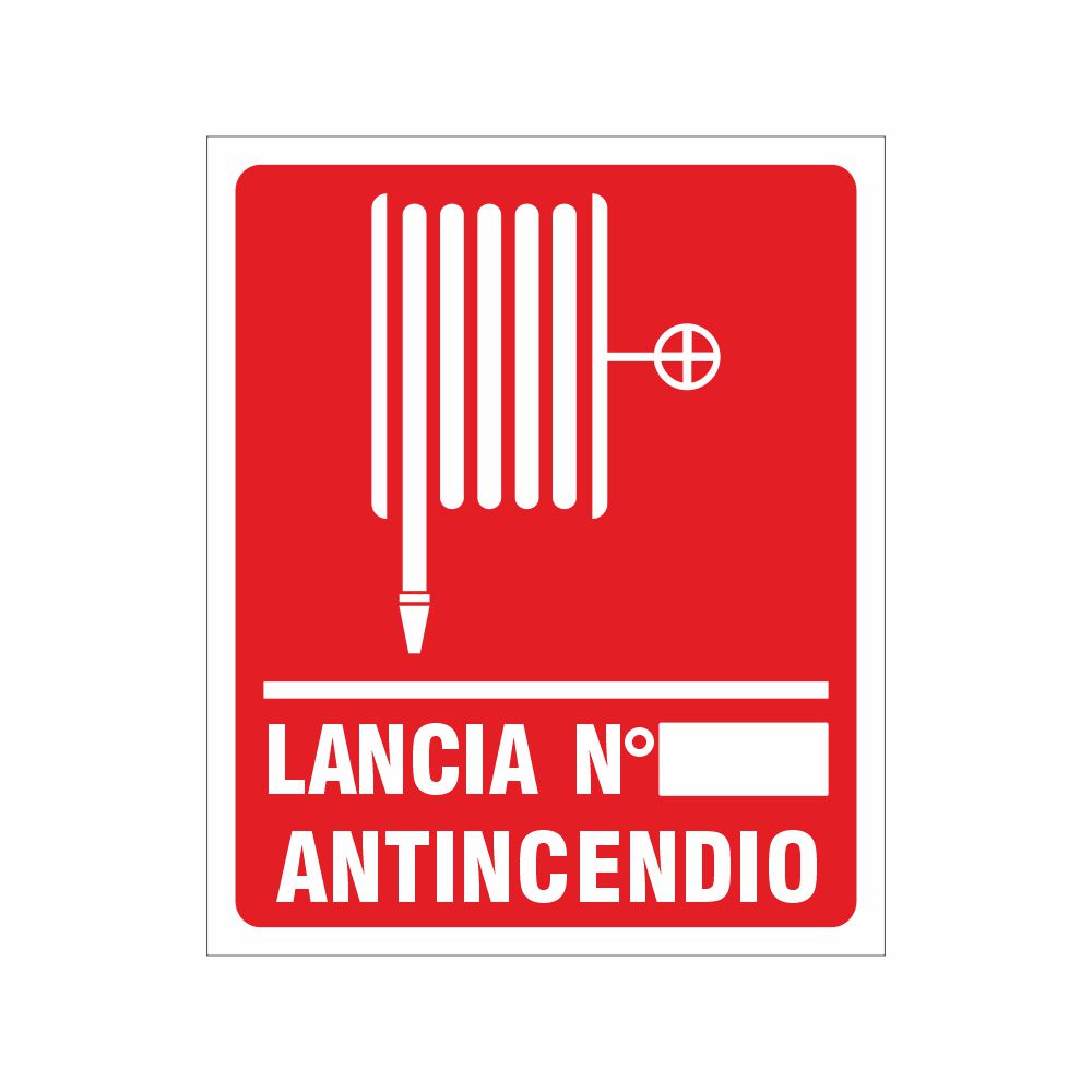 Cartello in alluminio preverniciato bianco, formato 120x145 mm, spessore 0,5 mm, stampa serigrafica pittogramma e scritta Lancia antincendio con spazio per il numero. Conforme D.Lgs. 81-08, UNI 7543.