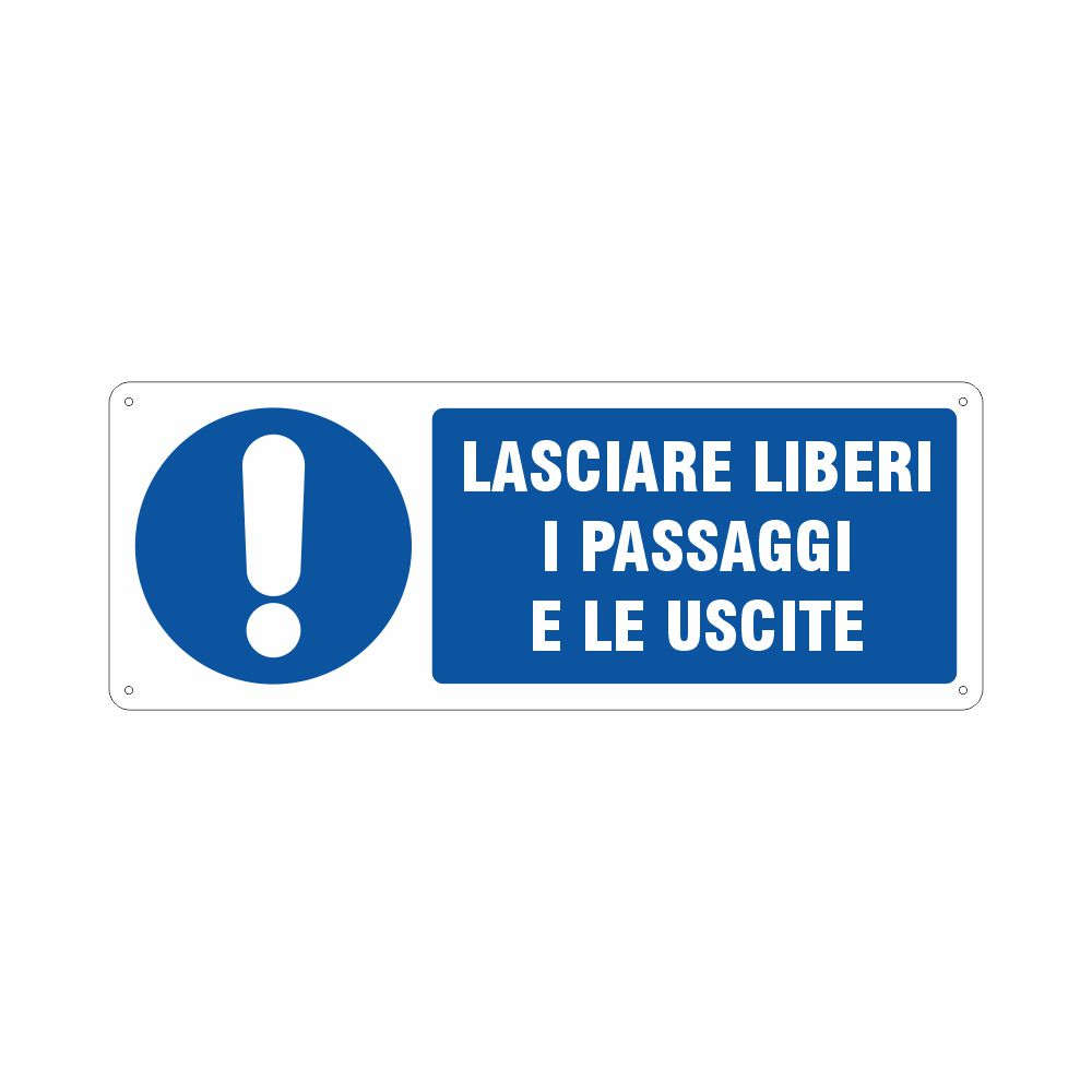 Cartello in alluminio preverniciato bianco spessore 0,5 mm, stampa serigrafica pittogramma e scritta Uscita di emergenza lasciare libero il passaggio, con fori e angoli arrotondati, imballo singolo. Indicato dal Codice Prevenzione Incendi (aggiornamento Maggio 2021) per segnalare l'uscita finale. Formato 333x125 mm. Conforme Codice prevenzione incendi, D.Lgs. 81/08, UNI 7543, UNI EN ISO 7010.