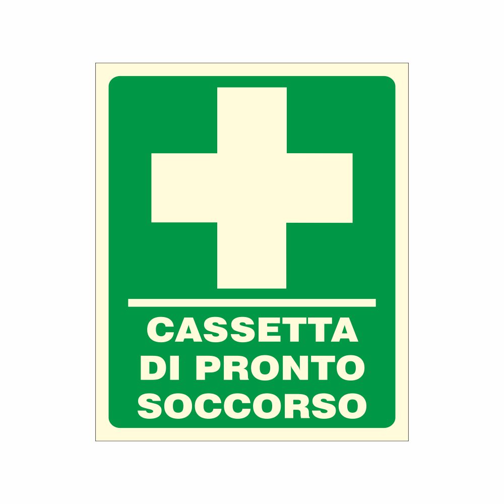 stampa serigrafica pittogramma e scritta Cassetta di pronto soccorso conforme UNI EN ISO 7010, con laminazione luminescente oppure Decorazione in pvc con base luminescente certficata DIN 67510 parte 1.