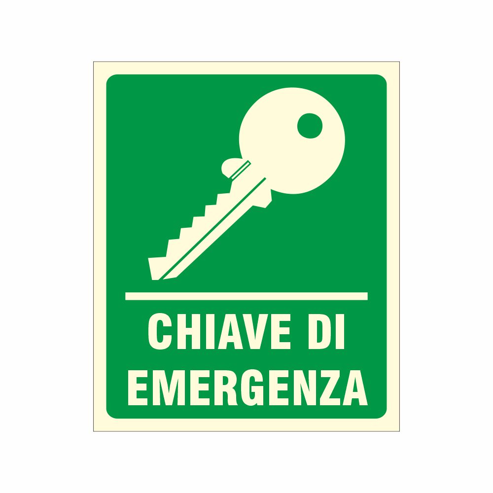 Cartello in alluminio preverniciato bianco (formati F, FN e P) spessore 0,5 mm, stampa serigrafica pittogramma e scritta Chiave di emergenza. Conforme D.Lgs. 81-08, UNI 7543. Le misure delle varianti sono espresse in mm.