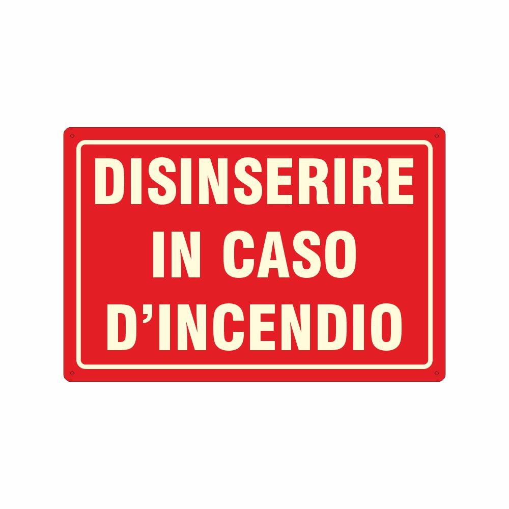 Cartello in alluminio preverniciato rosso spessore 0,5 mm, stampa serigrafica scritta Disinserire in caso di incendio. Formato 300x200 mm. Conforme D.Lgs. 81-08, UNI 7543.