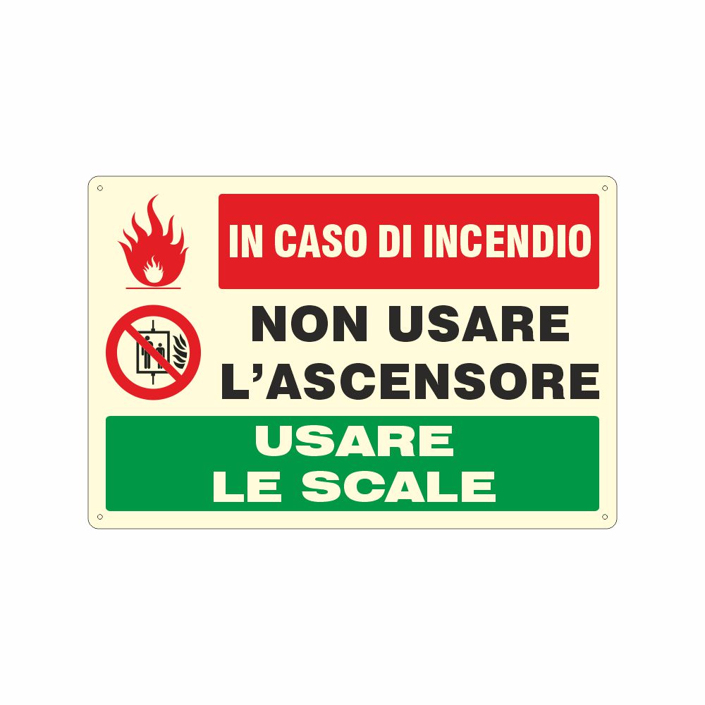 Cartello in alluminio preverniciato bianco spessore 0,5 mm, stampa serigrafica pittogrammi e scritta in caso di incendio non usare l'ascensore usare le scale, con laminazione luminescente oppure Decorazione in pvc con base luminescente certificata DIN 67510 parte 1.