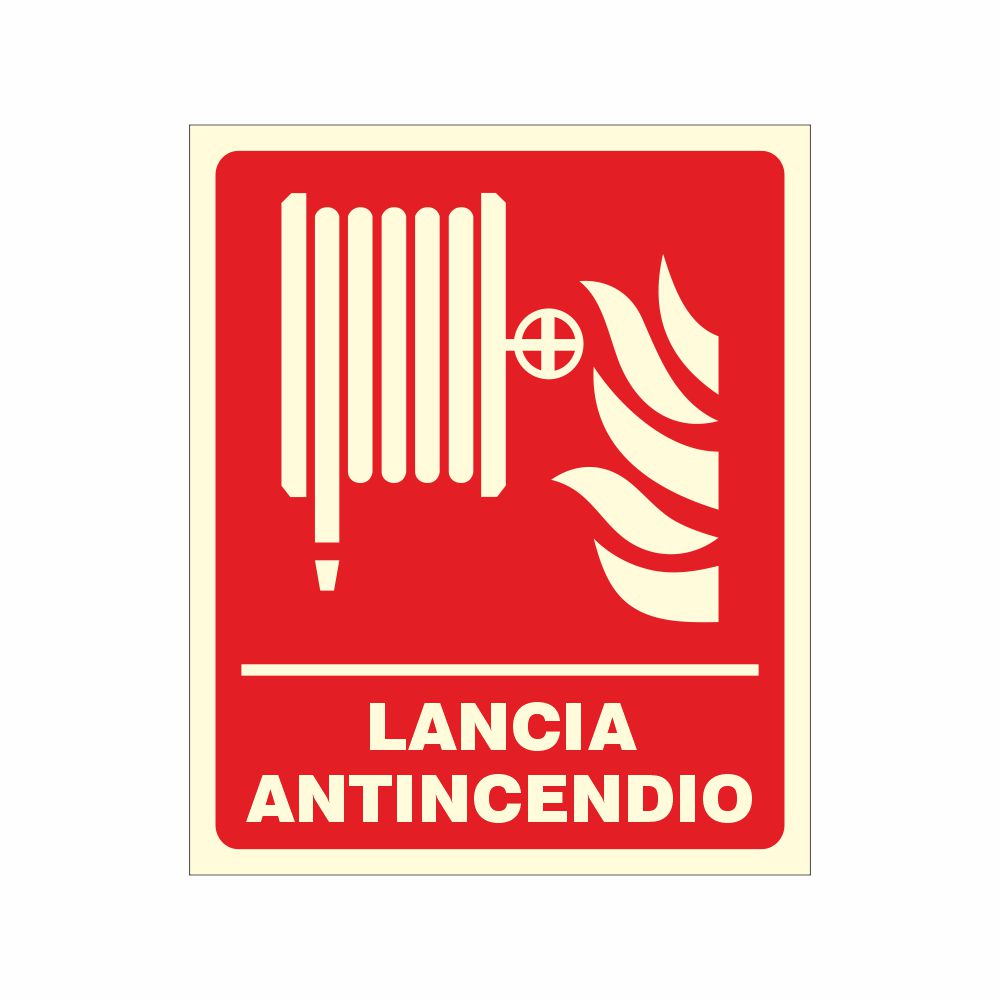 Cartello in alluminio preverniciato spessore 0,5 mm. stampa serigrafica pittogramma e scritta lancia antincendio con spazio per il numero, conforme UNI EN ISO 7010, con laminazione luminescente oppure Decorazione in pvc con base luminescente certficata DIN 67510 parte 1. Formato 230x310 mm. Conforme D.Lgs. 81-08, UNI 7543, UNI EN ISO 7010.