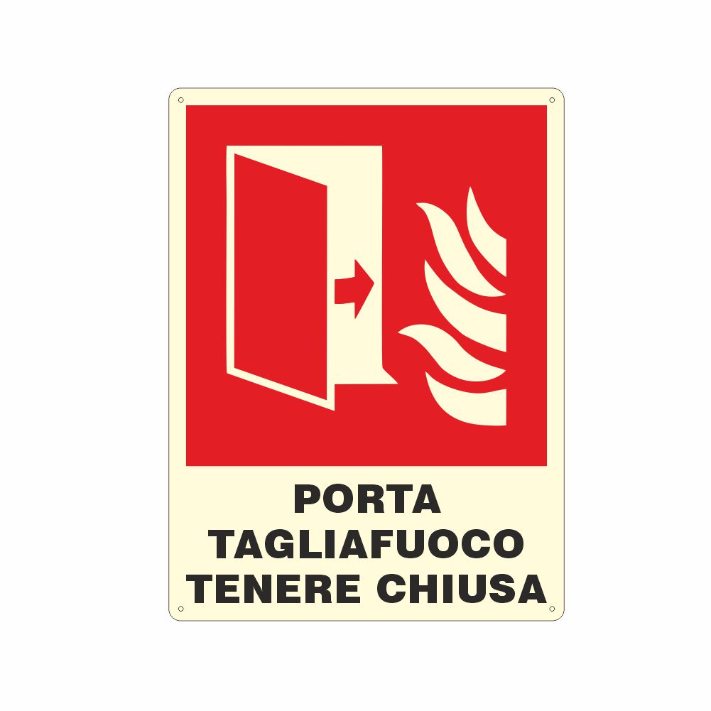 stampa serigrafica pittogramma e scritta porta tagliafuoco - tenere chiusa,conforme UNI EN ISO 7010 con laminazione luminescente oppure Decorazione in pvc con base luminescente certficata DIN 67510 parte 1.