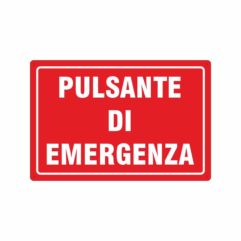 Cartello in alluminio preverniciato rosso spessore 0,5 mm, stampa serigrafica scritta pulsante di emergenza. Formato 200x150 mm. Conforme D.Lgs. 81-08, UNI 7543.