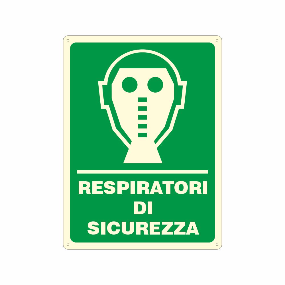Cartello in alluminio preverniciato bianco , spessore 0,5 mm, stampa serigrafica pittogramma e scritta Respiratori di sicurezza. Formato 230x310 mm. Conforme D.Lgs. 81-08, UNI 7543.