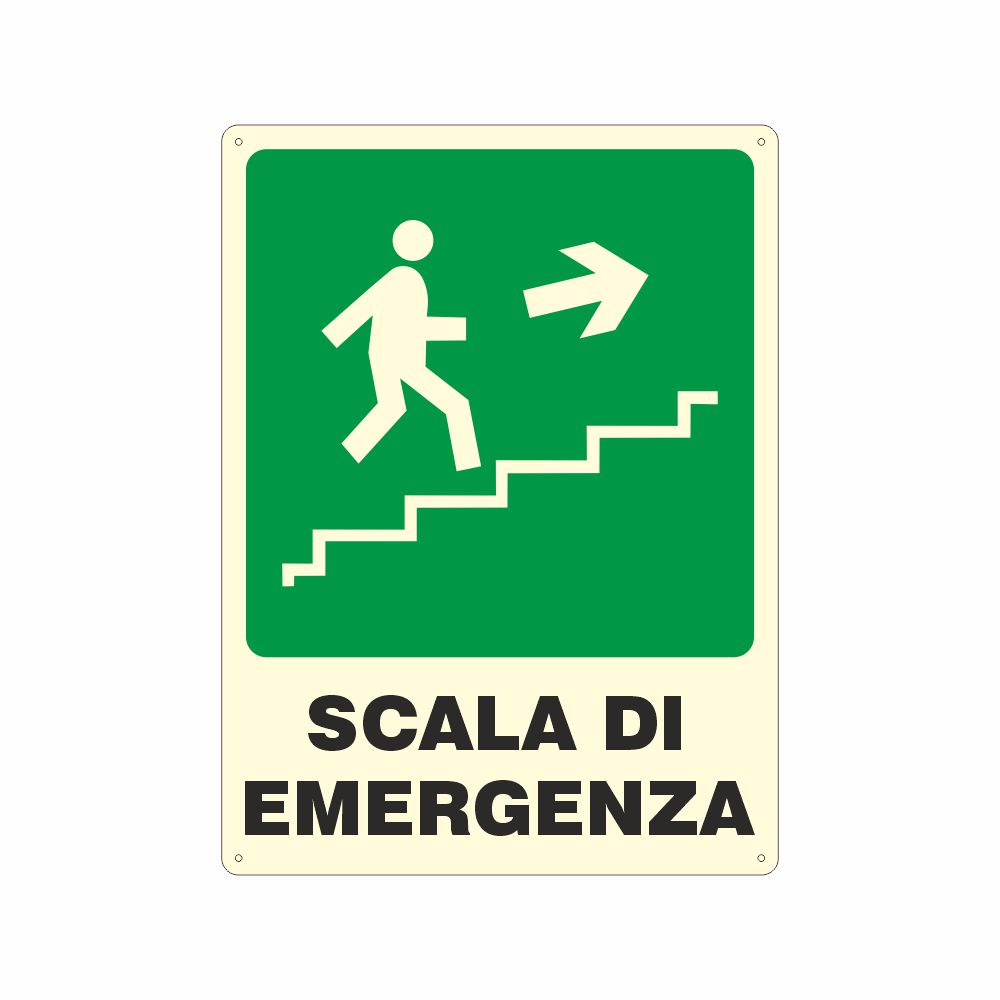 stampa serigrafica pittogramma e scritta Scala di emergenza in alto a destra con laminazione luminescente, dimensione 230x310 mm.