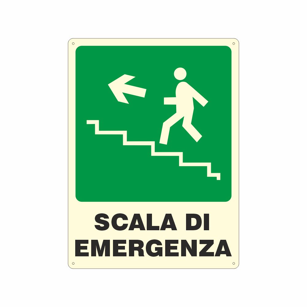 Cartello in alluminio preverniciato spessore 0,5 mm. stampa serigrafica pittogramma e scritta Scala di emergenza in alto a destra con laminazione luminescente oppure Decorazione in pvc con base luminescente certficata DIN 67510 parte 1. Conforme D.Lgs. 81-08, UNI 7543.