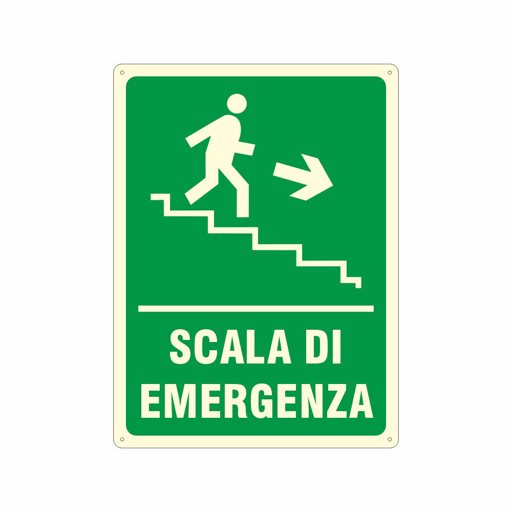 Cartello in alluminio preverniciato spessore 0,5 mm. stampa serigrafica pittogramma e scritta Scala di emergenza in basso a sinistra con laminazione luminescente oppure Decorazione in pvc con base luminescente certficata DIN 67510 parte 1. Conforme D.Lgs. 81-08, UNI 7543.