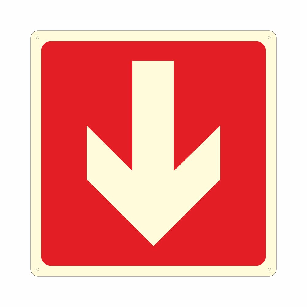 Cartello in alluminio preverniciato bianco (formati S e F) o rosso (formato B), spessore 0,5 mm, stampa serigrafica pittogramma freccia direzionale antincendio. Conforme D.Lgs. 81-08, UNI 7543.