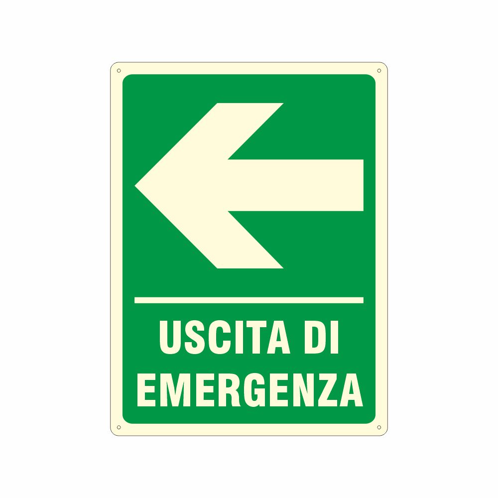 stampa serigrafica pittogramma e scritta uscita di emergenza a sinistra, da associare ai cartelli con codice SL40402 ISO e SL40403 ISO per la conformità alla norma UNI EN ISO 7010, con laminazione luminescente oppure Decorazione in pvc con base luminescente certficata DIN 67510 parte 1.