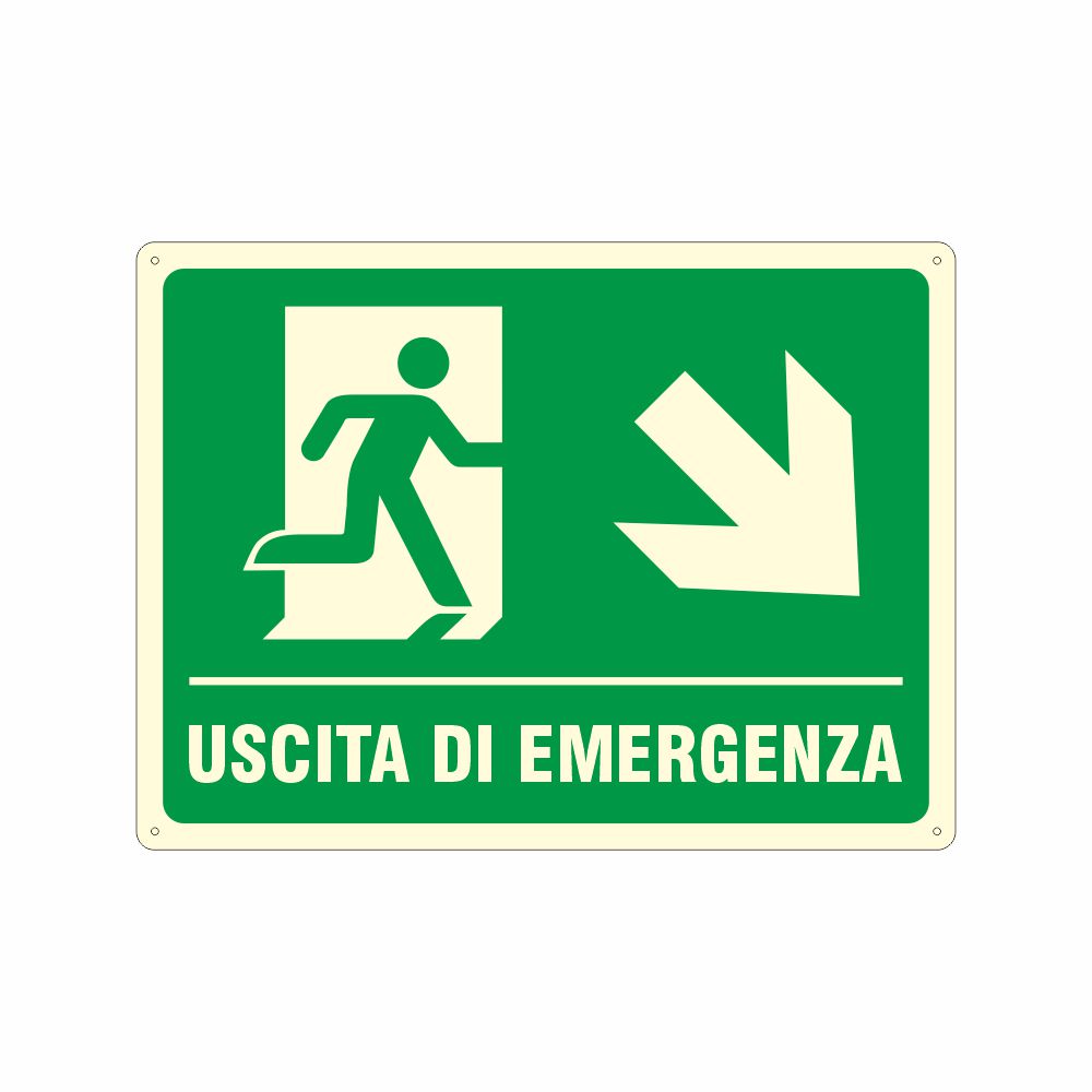 stampa serigrafica pittogramma e scritta uscita di emergenza in basso a destra conforme UNI EN ISO 7010, con laminazione luminescente oppure Decorazione in pvc con base luminescente certficata DIN 67510 parte 1.