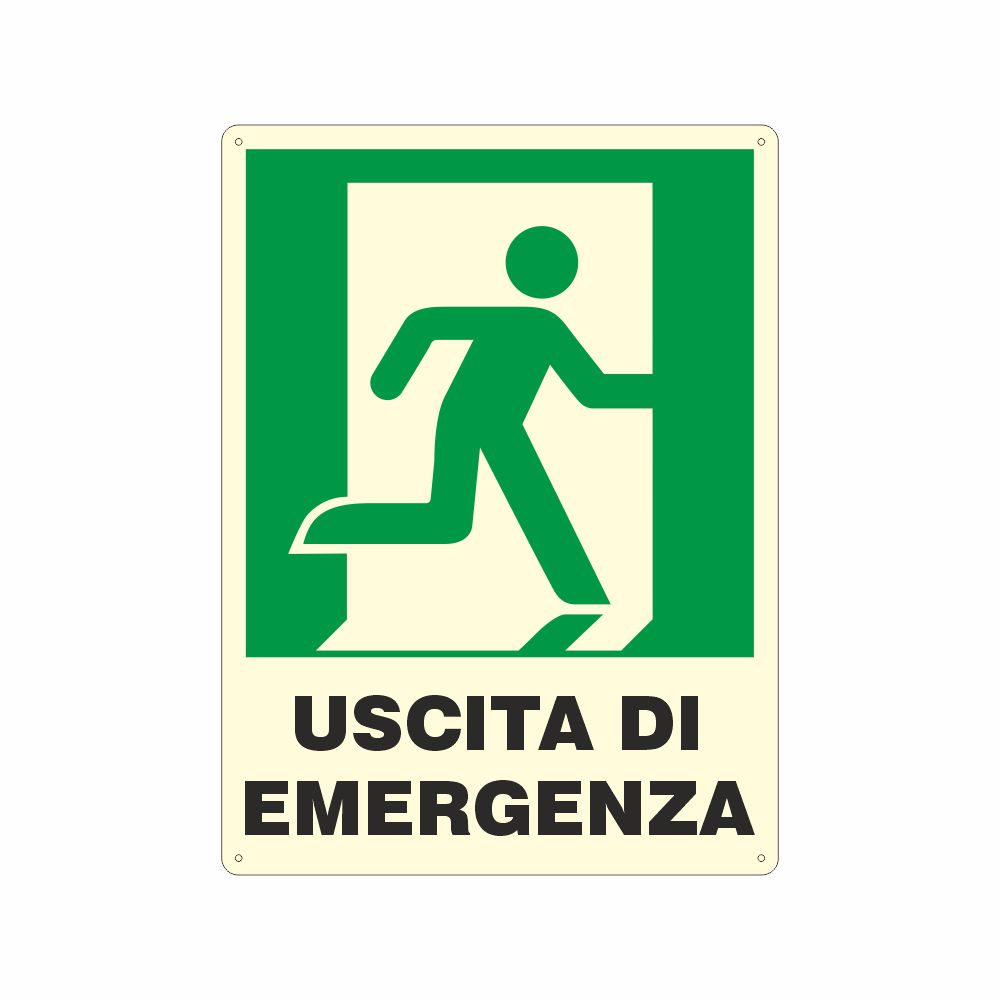 stampa serigrafica pittogramma e scritta Uscita di emergenza a destra conforme UNI EN ISO 7010, con laminazione luminescente oppure Decorazione in pvc con base luminescente certficata DIN 67510 parte 1.