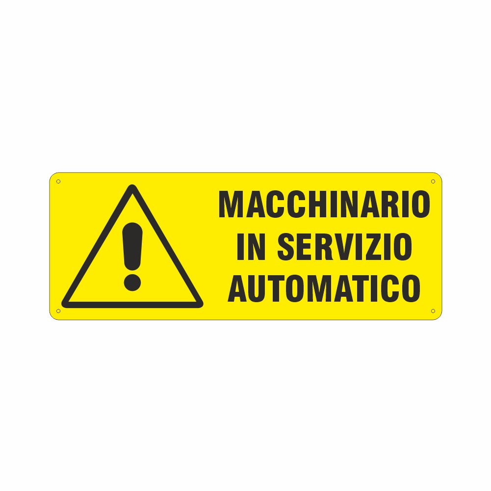 Cartello in alluminio preverniciato giallo spessore 0,5 mm, stampa serigrafica pittogramma e scritta macchina ad avviamento automatico, con fori e angoli arrotondati, imballo singolo. Conforme D.Lgs. 81-08 e UNI 7543. Formato 333x125 mm