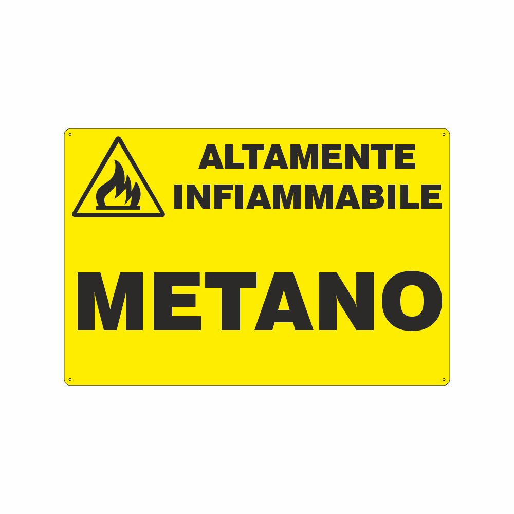 Cartello in alluminio preverniciato giallo spessore 0,5 mm, stampa serigrafica pittogramma e scritta Metano, con fori e angoli arrotondati, imballo singolo. Formato 333x125 mm. Conforme D.Lgs. 81-08 e UNI 7543.