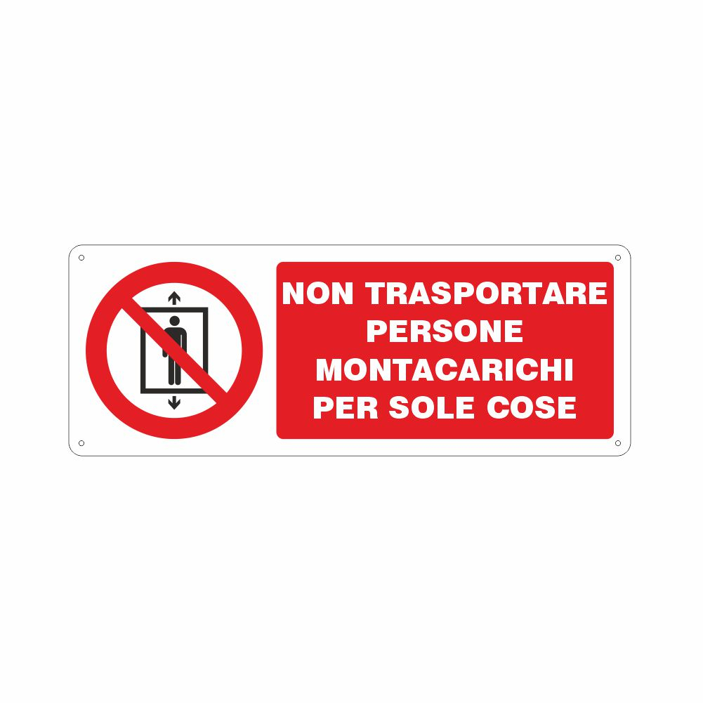 Cartello in alluminio preverniciato bianco spessore 0,5 mm, stampa serigrafica pittogramma e scritta Non trasportare persone - montacarichi per sole cose, con fori e angoli arrotondati, imballo singolo.