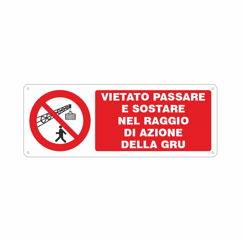 Cartello Vietato passare sotto i carichi sospesi Cartello in alluminio preverniciato bianco spessore 0,5 mm Pittogramma e scritta Vietato sostare e passare sotto impalcature e carichi sospesi Stampa durevole e resistente. Angoli arrotondati Imballo in nylon Dimensione 333x500 mm Distanza di visibilità 12 metri Conforme D.Lgs. 81-08, UNI 7543. Utilizzo: questo cartello si applica nei cantieri o nelle aree di lavoro dove sono presenti impalcature, gru, carroponti o altro tipo di attrezzature per lo spostamento dei carichi pesanti al fine di vietare l'avvicinamento a causa del poteziale rischio di incidenti in caso di rottura di un carico o di caduta di materiale dall'alto. Metodo di adesione consigliato: collante siliconico su muro o su superficie liscia e piana
